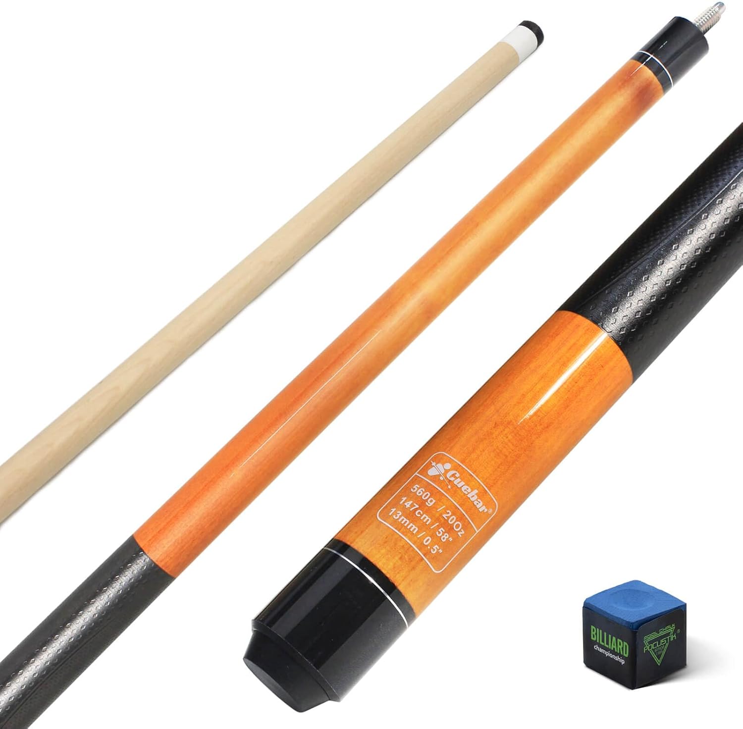 CUEBAR Pool Cue Stick is a premium 58-inch cue designed for both men and women, available in weights from 18 to 21 ounces and a variety of vibrant colors. Crafted from high-quality Hardrock Maple wood, it features a unique 3D grip for enhanced comfort and control. The cue comes with a durable leather tip and a robust joint design for precise hits, while the black rubber bumper protects it from damage. Each purchase includes a cue chalk for better play, and CUEBAR offers a 1-year warranty with 24/7 support, ensuring an exceptional experience for players of all levels.