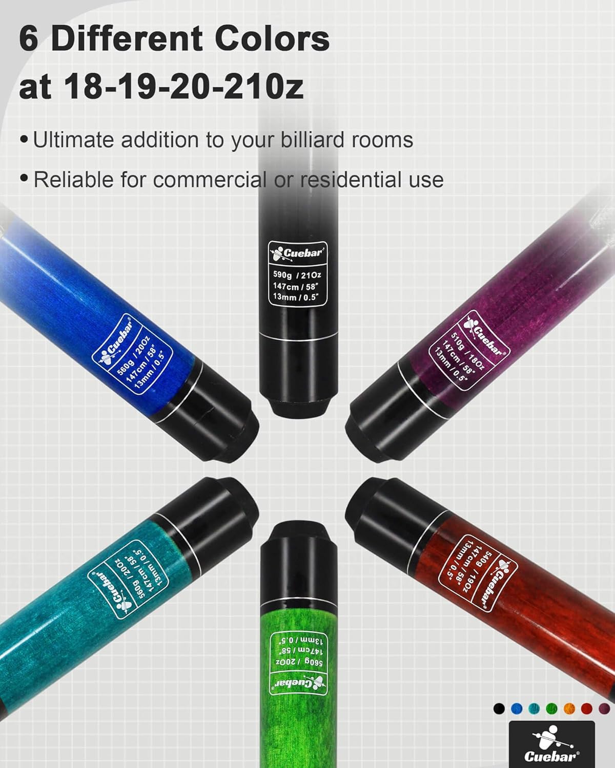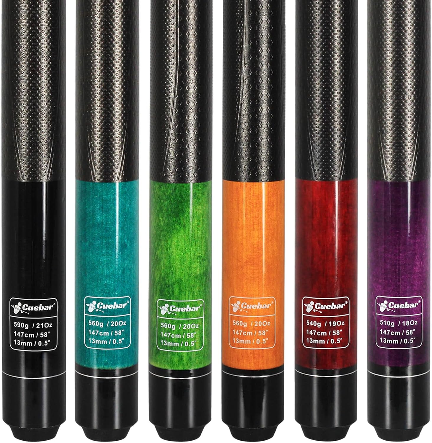 CUEBAR Pool Cue Sticks Set of 6 Specifications: 【Length】58 Inches Pool Cues(Standard Length for Adult,Suitable for Men or Women Use) 【Weights】18 19 20 21 Ounces 【Colours】6 colors from Purple, Red,Blue,Teal, Green, Orange, Black 【Shaft】Quality Hardrock Maple Wood 【Grip】Unique Nano Wrap Style to Provides Additional Friction and Comfort 【Butt】Quality Hardrock Maple Wood with Multi-layer Hand Painting in Trendy Colours 【Tip】1/2-Inch (ca. 13mm) Medium Glued on Leather Tip (Original Factory Setting, You can Replace it as your Favor after Received) 【Joints】5/16x 18 Cue's Joint Collar & Joint Pin for a Firm Hit 【Bumper】 Black Rubber Bumper to Protects the Pool Cue Sticks Avoid Damaging 【Free Gift 1】3* Cue Chalks (Reduces Miscues, Increase Control, Essential for All Levels of Play) 【Warranty】CUEBAR Provide 1 Year Manufacturer and 7/24 Support. Any Question, Feel Free to Call or Email CUEBAR.