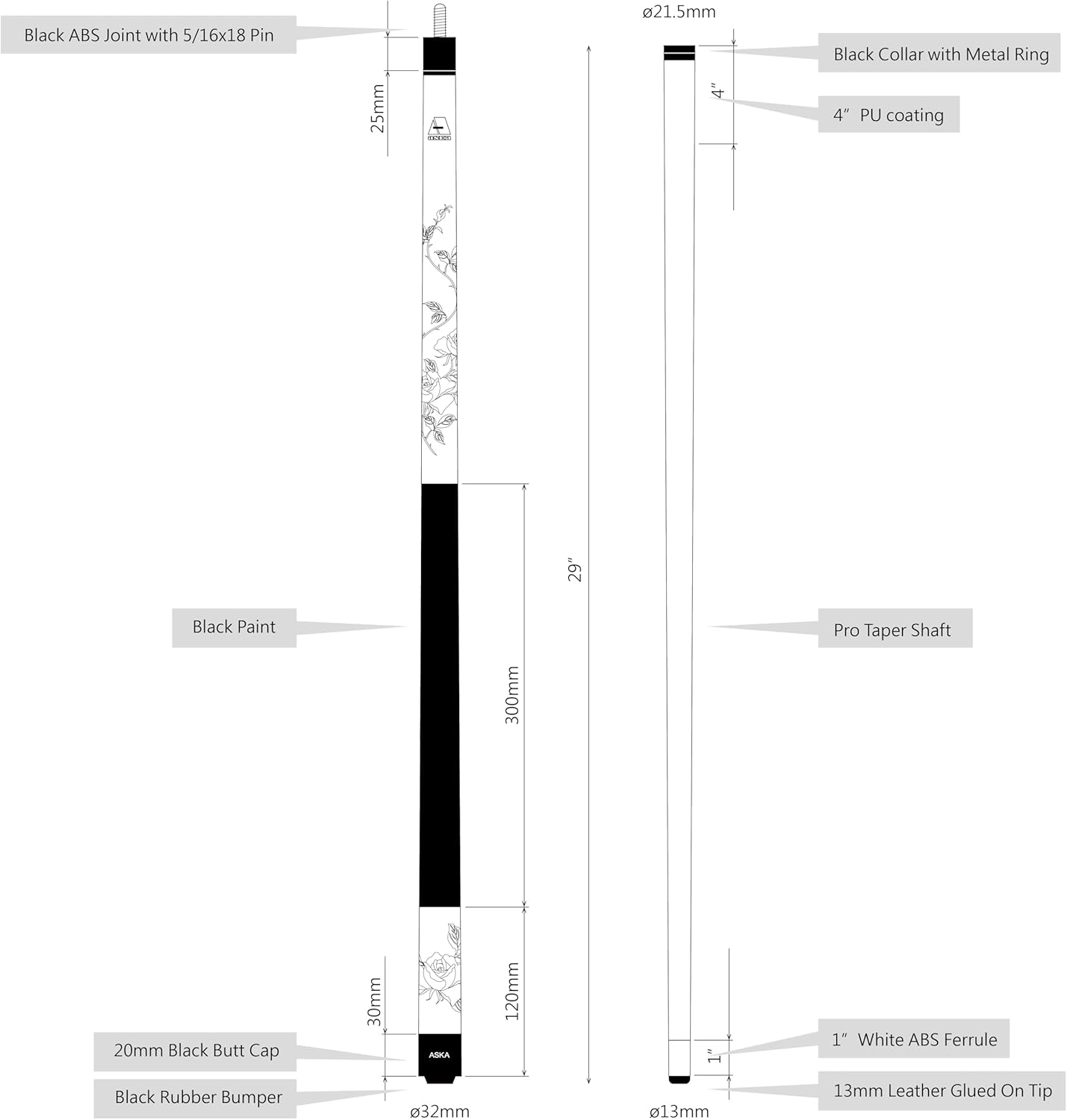 ASKA Black Rose Pool Cue Stick – 58" Standard Length, 21 oz The ASKA Black Rose Pool Cue combines classic performance with a striking artistic design. Featuring a detailed red rose graphic on a sleek black cue, this cue stands out while delivering reliable playability for all skill levels. CANADIAN HARD ROCK MAPLE SHAFT: 29" shaft made from durable Canadian hard rock maple for a smooth, consistent stroke.STANDARD 58" CUE LENGTH: Professional-size pool cue offering balanced feel and control for everyday play.13MM HARD LEATHER TIP: Long-lasting glued-on tip ensures consistent cue ball contact and dependable performance.WRAPLESS HANDLE DESIGN: Smooth no-wrap grip provides a clean feel preferred by many players.SELECT WEIGHT: A heavier cue (20–21 oz) provides more natural momentum for powerful breaks and long-distance shots, while a lighter cue (18–19 oz) offers superior finesse and better cue ball control for delicate spin shots..BLACK WITH RED ROSE DESIGN: Stylish and distinctive look that stands out in any game room or billiard setup. Designed for beginners, recreational players, and experienced billiards enthusiasts alike, the ASKA Black Rose pool cue offers a combination of durability, performance, and visual appeal. Whether you're upgrading your personal cue or adding a unique piece to your collection, this cue delivers reliable results with a bold design.
