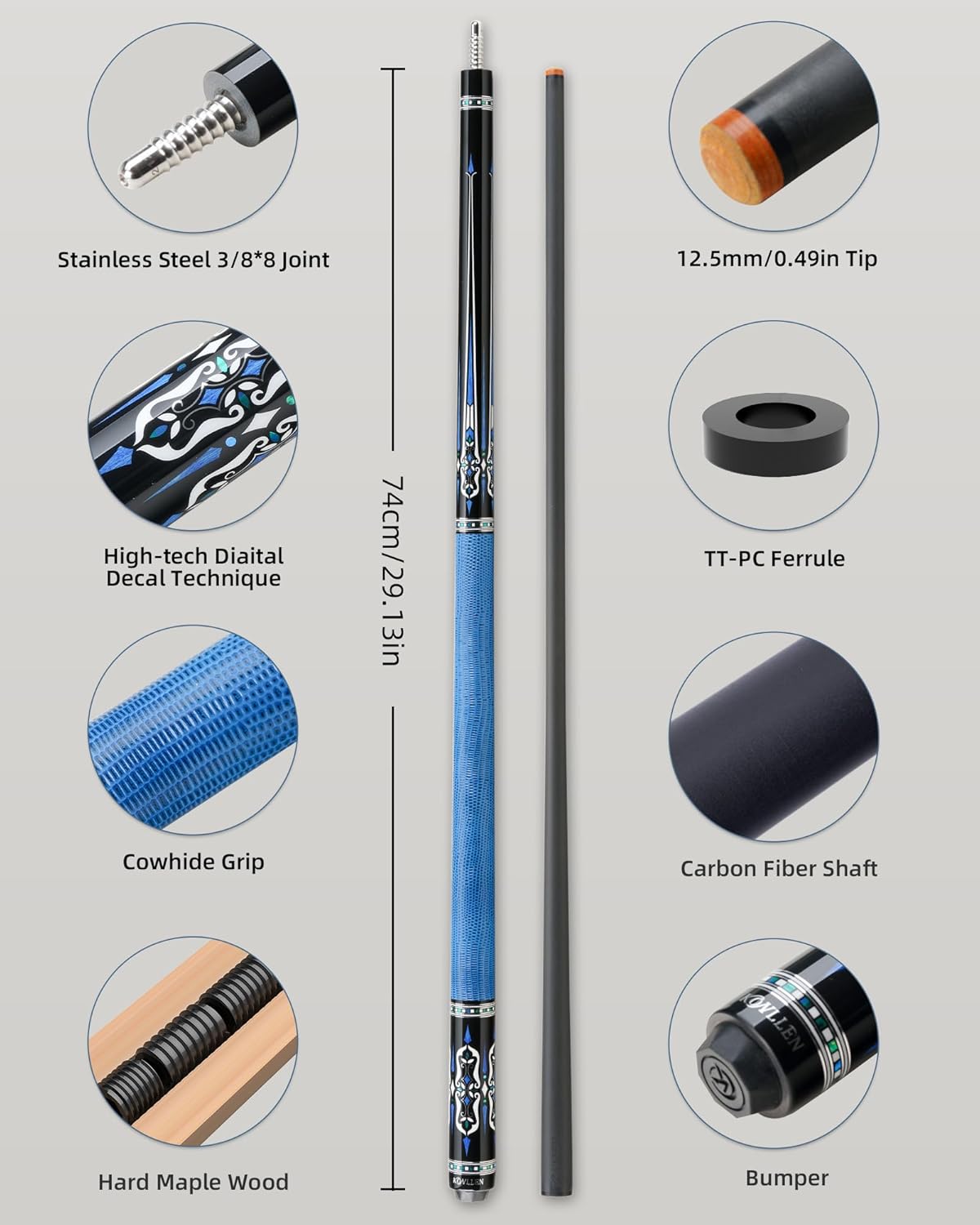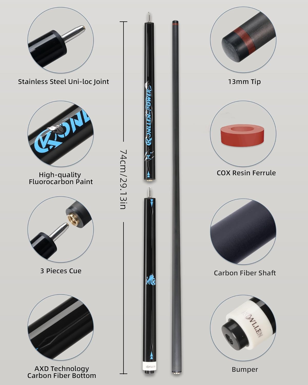 Built for players who want a complete, professional setup — without the hassle of matching individual pieces. This KONLLEN carbon fiber cue set delivers everything you need in one purchase, combining precision, power, and protection into a single, well-matched system. At the core of the set is a low deflection carbon fiber playing cue, designed to provide consistent performance and improved cue ball control. The carbon fiber shaft offers enhanced stability and reduced deflection compared to traditional wooden cues, helping players achieve more accurate positioning and reliable shot results during practice and competitive play. To handle the most demanding shots, the set also includes a dedicated break jump cue. Engineered for explosive breaks and controlled jump shots, it eliminates the need to purchase a separate break or jump cue. Whether you’re opening a rack or clearing an obstacle ball, this cue is built to deliver power when you need it most. Keeping the entire setup protected is a durable cue case, designed to securely store both cues and accessories. The organized interior helps prevent movement and impact during transport, making it easy to carry your complete setup to league nights, tournaments, or practice sessions. Instead of worrying about compatibility, balance, or performance differences between separately purchased items, this set is carefully matched to work together as a complete system. From shot-making precision to break power and long-term protection, every component serves a clear purpose. One purchase. One setup. Ready to play. This all-in-one cue set is ideal for players upgrading to carbon fiber equipment, competitive league players, or anyone looking for a professional, worry-free billiards gift.