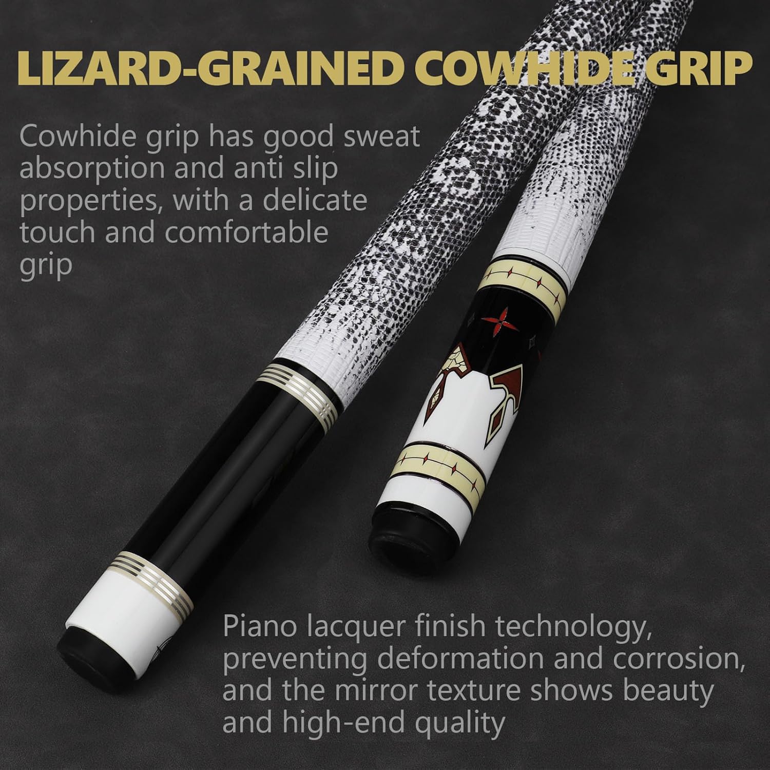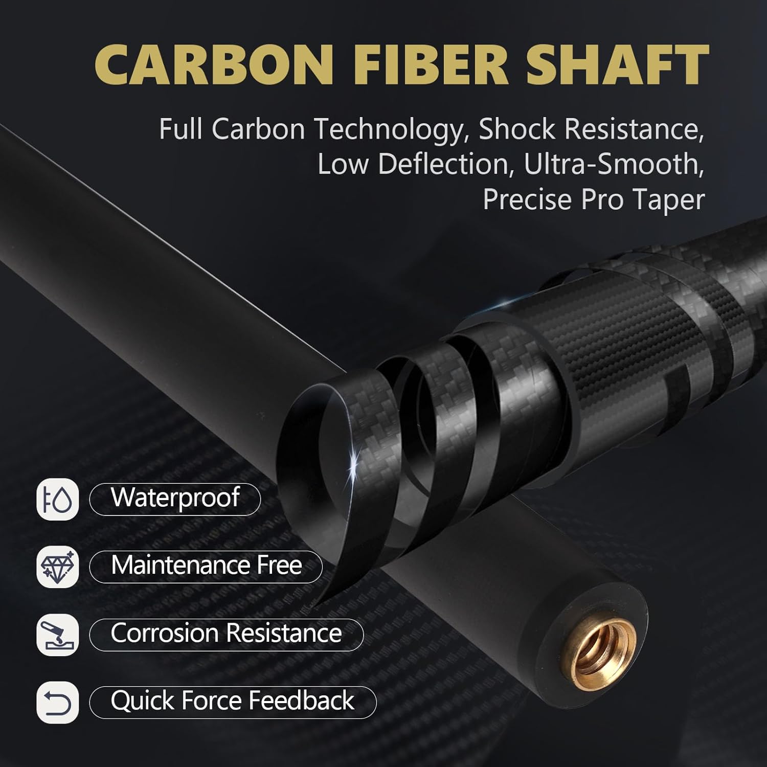 Feature: Carbon Fibre Pool Cue Cue Shaft: Carbon Fiber Cue Butt: Carbon Fiber Graphite Composite Wrap: Genuine Leather Cue Tip: 12.5mm 6-Layer Pigskin Tips Cue Joint: Uni-loc Pin Joint or 3/8*8 Pin Joint Ferrule: XTC Level Length: 58inch Weight: 19oz