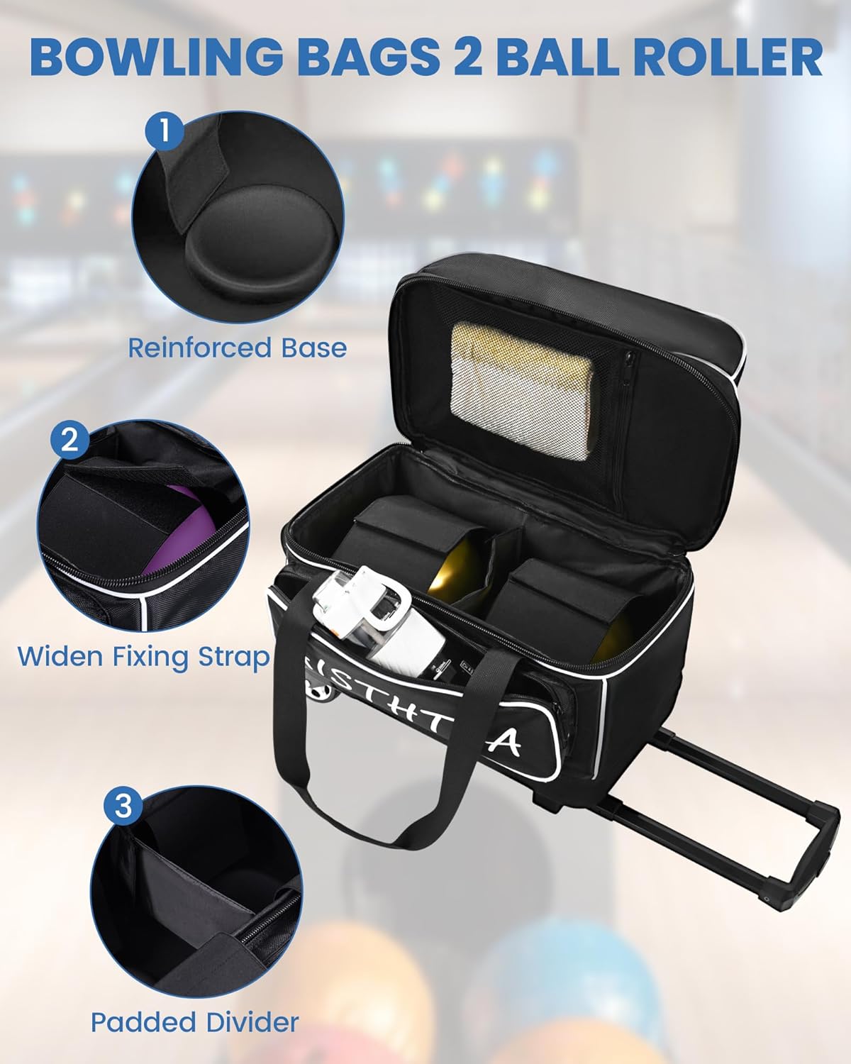 This double ball bowling bag with wheels is designed for bowling enthusiasts and professionals, combining durability, practicality, and portability, making it ideal for daily practice and competitions. Made with 1680D thickened Oxford cloth, it's waterproof, stain-resistant, wear-resistant, and tear-resistant, featuring a reinforced base for stable placement and preventing tipping. Two double-sided bowling ball cleaning mats are included for easy ball care, keeping your bowling balls clean. Smooth, quiet wheels with a retractable lever make pushing and pulling easy and effortless, making it convenient for daily practice or competitions. Whether for personal use or as a gift for a bowling friend, this double ball bowling bag with wheels is a high-quality choice that combines practicality and durability.