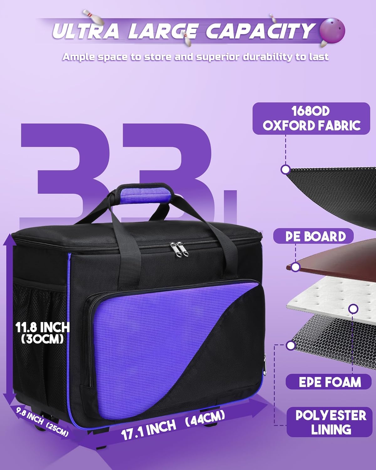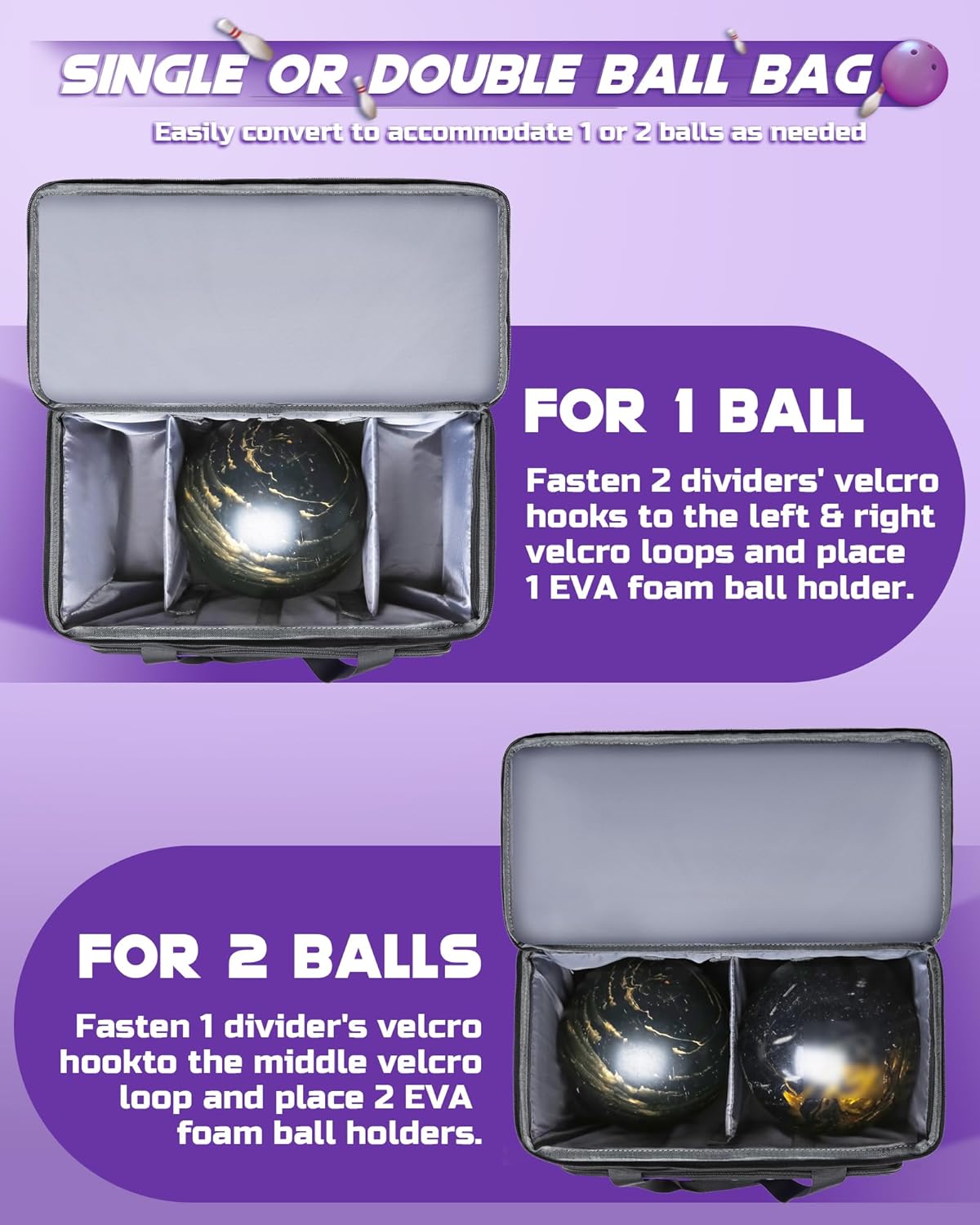 A MUST-HAVE FOR BOWLING ENTHUSIASTS! Product: Bowling Roller Bag Quantity: 1 Accessories: 1x Bowling Roller Bag 1x Shoe Bag 2x Dividers 2x Foam Ball Holders Material: Aluminum Polyester Polyvinyl Chloride Item Weight: 10.1lbs Item Dimensions: 17.1"(L) x 9.8"(W) x 11.8"(H) WHY THIS BAG ROCKS? Flexibility is key! No need to buy separate bags for 1 or 2 balls, this one's got you covered. The detachable dividers open up endless possibilities. It's not just for bowling, use it wherever you need it! TOP 5 FEATURES 1. Convertible for 1 or 2 Balls 2. No-size-limit Shoe Bag 3. Extra Compartment 4. Side Mesh Pockets 5. Thickened EVA Foam Ball Holder Friendly Reminder: Colors may vary slightly due to screen differences. Keep this in mind when viewing product images.