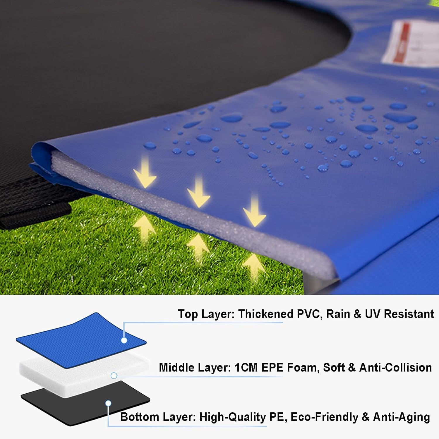 Upgrade Your Trampoline Safety with Our Premium Replacement PadIf your current trampoline pad is worn, torn, or no longer provides reliable protection, our universal safety pad is the ideal solution to restore safety and extend your trampoline’s lifespan.✔Feature:Safety anti-collision buffer, protect your children and prevent injuries.Portable folding, saving space, not easy to deform, easy to clean, easy to install.✔Why Choose Our Safety Pad?- Safety First: Protect your family and your trampoline investment with a pad that prioritizes impact resistance and long-term durability.- Cost-Effective: Replacing your pad is far more affordable than buying a new trampoline, and our design ensures years of reliable use.- Hassle-Free Setup: No tools are needed—just secure the straps to your frame and enjoy restored safety in minutes.✔Specification:Material: PE+SpongeSize: 6FT 183cm/72 inch, 8FT 244cm/96 inch, 10FT 306cm/120 inch, 12FT 366cm/144 inch, 14FT 428cm/168.5 inch, 16FT 488cm/192 inch✔Package include:1* trampoline spring cover (Safety pad only)✔Note:1. Please measure the size of your trampoline before purchasing, choose the appropriate safety mat.2. Due to different monitors, please allow a little color difference. Please refer to the actual product.3. Please allow a slight error of 1-3 cm due to manual measurement.