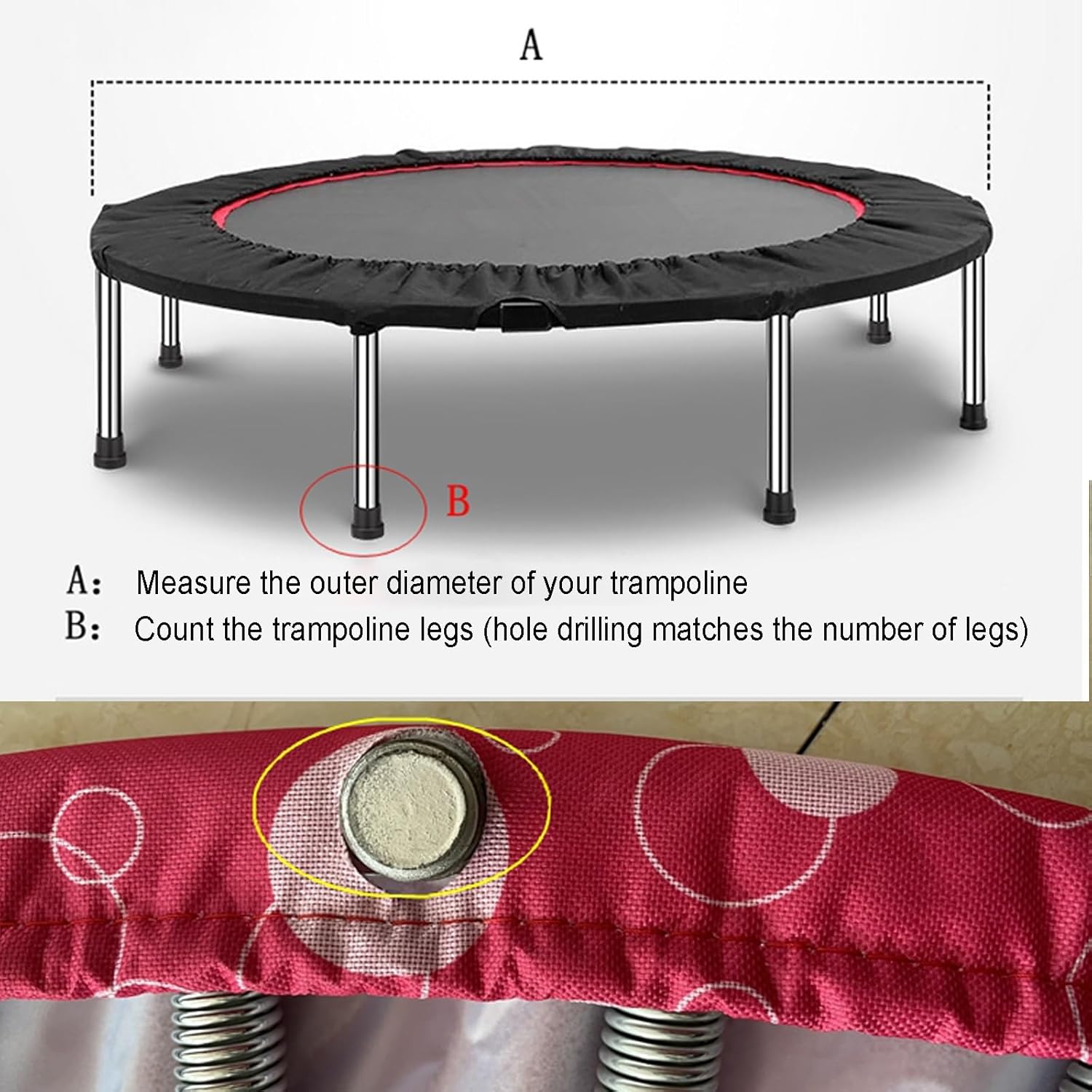 Upgrade Your Trampoline Safety with Our Premium Replacement PadIf your current trampoline pad is worn, torn, or no longer provides reliable protection, our universal safety pad is the ideal solution to restore safety and extend your trampoline’s lifespan.✔Feature:Safety anti-collision buffer, protect your children and prevent injuries.Portable folding, saving space, not easy to deform, easy to clean, easy to install.✔Why Choose Our Safety Pad?- Safety First: Protect your family and your trampoline investment with a pad that prioritizes impact resistance and long-term durability.- Cost-Effective: Replacing your pad is far more affordable than buying a new trampoline, and our design ensures years of reliable use.- Hassle-Free Setup: No tools are needed—just secure the straps to your frame and enjoy restored safety in minutes.✔Specification:Material: Oxford cloth+sponge+PESize: 36 inches/91cm -5 holes , 36 inches/91cm -6 holes , 38 inches/96cm -5 holes , 38 inches/96cm -6 holes , 38 inches/96cm -8 holes , 40 inches/101cm -5 holes , 40 inches/101cm -6 holes , 45 inches/114cm -6 holes , 45 inches/114cm -8 holes , 48 inches/122cm -6 holes , 48 inches/122cm -8 holes , 50 inches/127cm -8 holes , 54 inches/137cm -8 holes , 60 inches/152cm -8 holes , 60 inches/152cm -10 holes✔Package include:1* trampoline spring cover (Safety pad only)✔Note:1. Please measure the size of your trampoline before purchasing, choose the appropriate safety mat.2. Due to different monitors, please allow a little color difference. Please refer to the actual product.3. Please allow a slight error of 1-3 cm due to manual measurement.