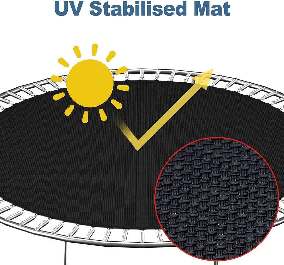 Good workmanship & bounce give a nice feeling when jumpingAn optimal fit gives the necessary tension for endless jumping fun.Packing List:Trampoline Jump Mat*1 (contains triangular buckle for easy installation and removal)Specifications:Name: Trampoline Replacement Jump MatMaterial: polypropylene meshColour: blackSizes(about):6FT36buckles , 8FT42buckles , 8FT48buckles , 10FT54buckles , 10FT56buckles , 10FT60buckles , 10FT64buckles , 12FT72buckles , 13FT80buckles , 14FT80buckles , 14FT88buckles- Measuring Tips to Help Determine whether Your Trampoline Fits Our Mat- Step 1: Measure the diameter of your trampoline's frame vertically and horizontally;- Step 2: Count the frame holes to determine the number of v-rings your trampoline mat needs;- Step 3: Measure your original springs, unstretched, from hook-end to hook-end- Please make sure that your trampoline is compatible with the frame size, v-rings' number, and spring size at the same time, otherwise the mat will not fit your trampoline
