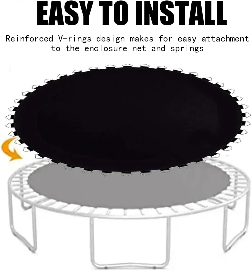describe:The number of V-rings and the diameter of the jump pad must match for good jumping power. Follow the instructions to install the jump pad.feature:The high-quality PP material is weather resistant, making the trampoline mattress last long.8 rows of stitching make this trampoline mattress more sturdy.The high bounce mattress allows kids and adults to jump higher and have more fun.Foldable design to save spaceEasy to assemble and disassemble without much effortSturdy metal V-hook for a good fit on the trampolineDurable round jump pad for indoor and outdoor useScope of application:Suitable for trampoline size: 14 feet / 4.27 metersNumber of V-Rings: 14FT(80V-Rings)Spring Length: For 6.5" SpringPacking list:Trampoline jumping mat*1 (including eyelets for easy installation and removal)Notice:Please measure the overall diameter of the trampoline and choose the appropriate sizePlease allow a slight error of 1-3 cm due to manual measurement.Due to different monitors, please allow a little color difference. Please refer to the actual product.