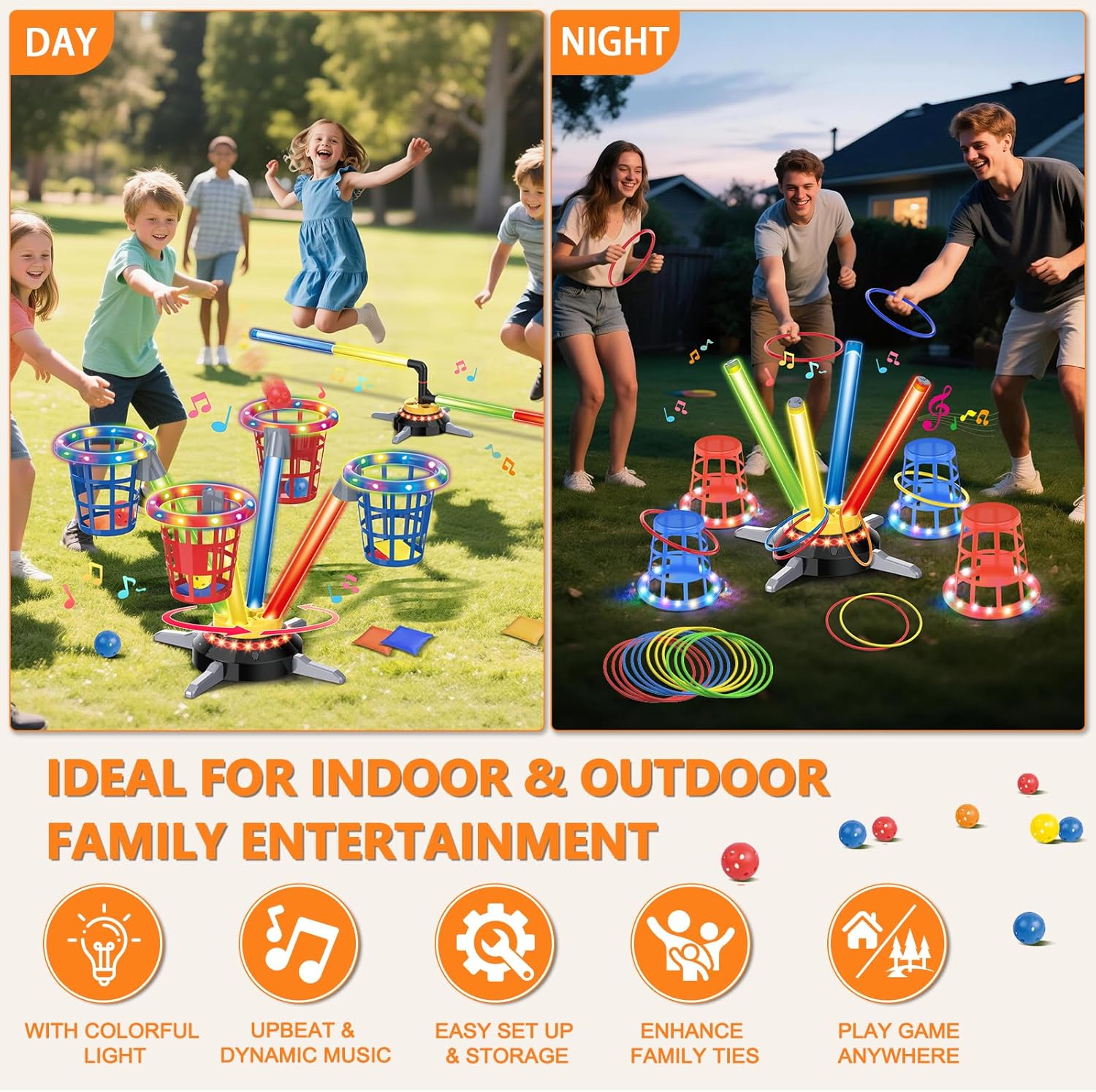 | Included Components | 1 x Rotating Base, 4 x 30cm Flow Tubes in 4 colors (with lights), 12 x 16cm Tossing Rings, 12 x Bean Bags, 12 x Throwing Balls, 4 x Throwing Buckets |