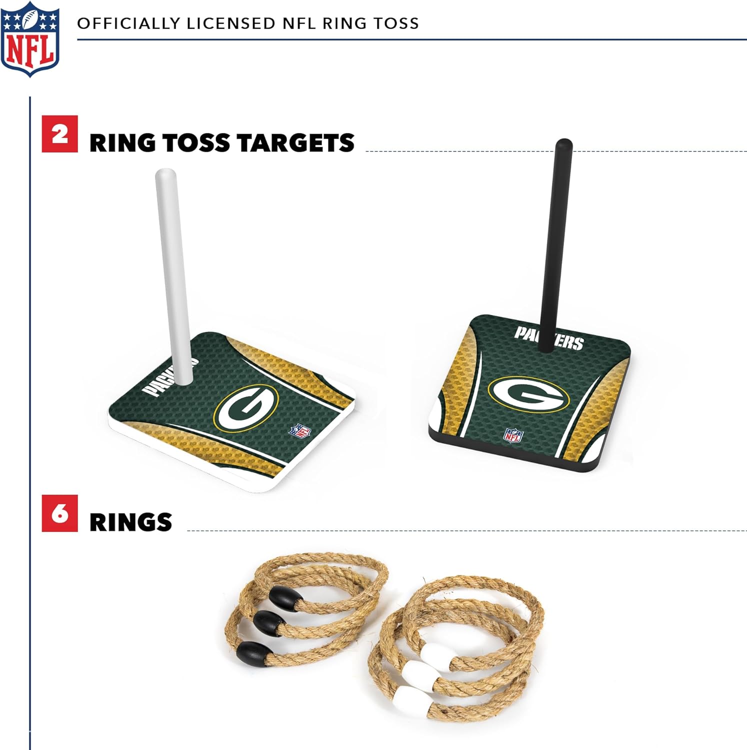 The NFL licensed Quoits set is a classic outdoor game with a modern twist. This set features the logos of all 32 NFL teams and is officially licensed by the league. The set includes 6 sisal quoits and a sturdy wooden base, perfect for a game of toss and ring in the backyard or at a tailgate. The quoits are made of durable sisal rope and have a weighted bead for accurate throws, ensuring a fun and challenging game for players of all skill levels. The wooden base is built to withstand the elements, making it a great choice for outdoor events. Whether you're a fan of the NFL or just looking for a classic outdoor game, the NFL licensed Quoits set is sure to be a hit.