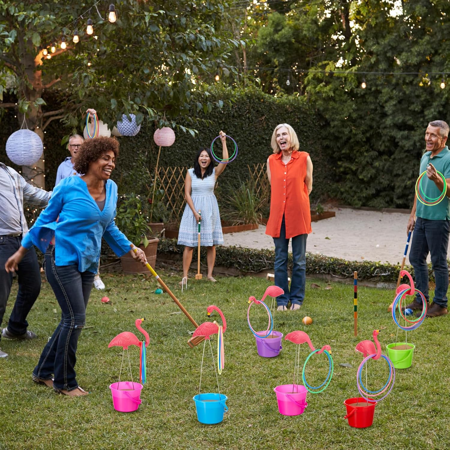 Features: You can enjoy the fun of the throwing games and other kinds of games with the ring toss hoops. In the process, you can release your pressure and improve your speed and agility. Specifications: Material: plastic Color: pink, rainbow Size: Pink Flamingos: about 5.62-11 inches Plastic Ferrule: three sizes available, 16cm/6.3inch, 18cm/7inch, and 20cm/7.8inch Beach bucket: height is 11cm/4.3inch, and the bottom is directly 11.5cm/4.5inch Package includes: 6 x Flamingos 60 x Plastic Ferrule 6 x Sand bucket Notes: Manual measurement, please allow slight errors on size. The color may exist a slight difference due to different screen displays.