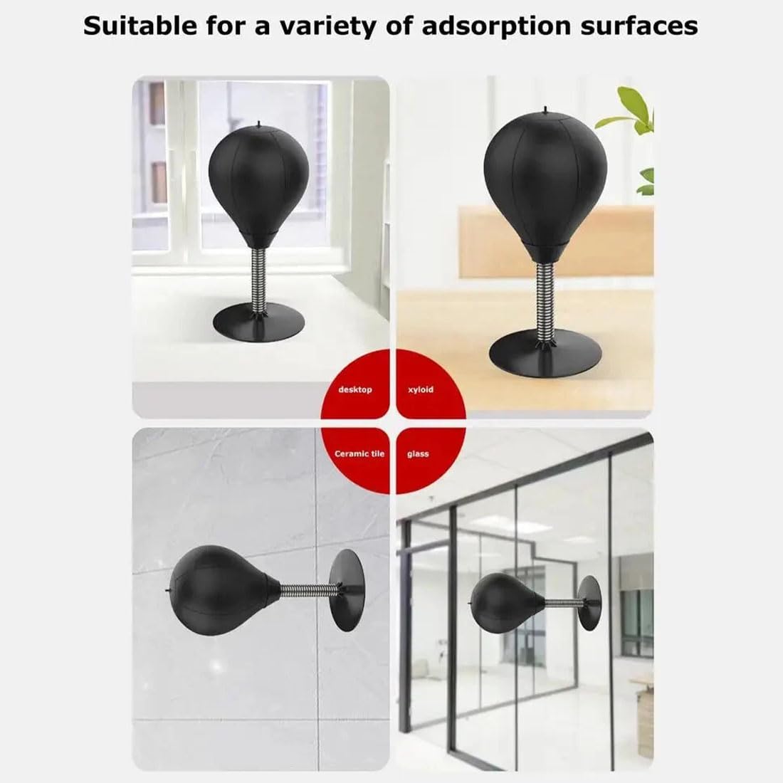 Whether you're releasing stress and venting your emotions at your desk Or doing a simple cardio workout at home to improve your health This desktop boxing ball is the perfect choice Specifications: Name: Table Top Punching Bag Color: Black, Black & Red Boxing Ball Material: Rubber Spring Material: Stainless Steel Suction Cup Size: 7in Product Height: 13.77in Weight: 900g Product Installation Instructions: 1. Insert the needle of the air pump into the air hole at the top of the ball, inflate it, and then pull it out 2. Tightly connect the ball to the base using the foam connecting rod 3. Press the base onto a clean, flat surface Package Includes: 1 Pc Desktop Punching Bag 1 Pc Air Pump 1 Pair of Boxing Gloves (Adult Size) Note: 1.Due to manual measurement, please allow a difference of 1-5g/1-2cm 2.Due to different displays and different lighting, the picture may not reflect the actual color of the item. Thank you for your understanding
