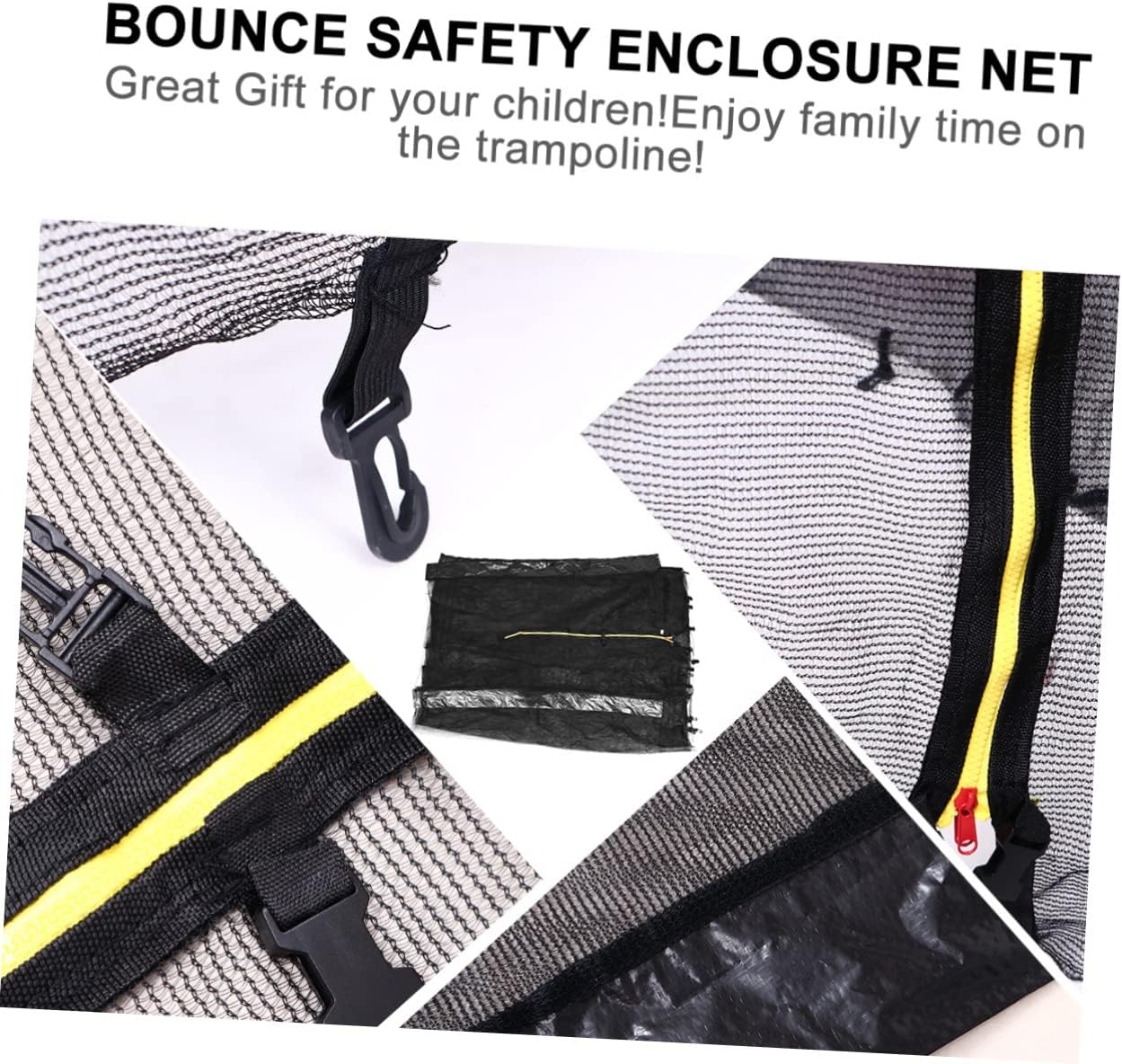 Package List 1 x Trampoline Protective Net Characteristics - Size: 240.00 x 160.00 x 0.20 cm/ 94.32 x 62.88 x 0.08 inch Bounce Protective Net. - Material: Nylon + PP. - Color: Black. - Closure zipper makes use easier. Minimize the risk of falling, and you from worries Trampoline Protection. - Creates a fun jumping experience without limiting visibility Bounce Safety Enclosure Net - Ensures maximum safety by connecting the net between the pad and jumping mat Trampoline Protective Net. - Highly quality polyester materialm, it is durable, safety net and easy to install Trampoline Mesh Net. - A good protective mesh to prevent your child fall off from the Trampoline.Goods InformationTrampoline Protective Net High density mesh makes it more solid and durable,and fine weave to ensure little fingers cannot become trapped.Bounce Safety Enclosure Net It is able to give the maximum protection for children, teenagers or adults.Bounce Protective Net The enclosure net wrapping around spring padding maximizes jumping space with safety guard