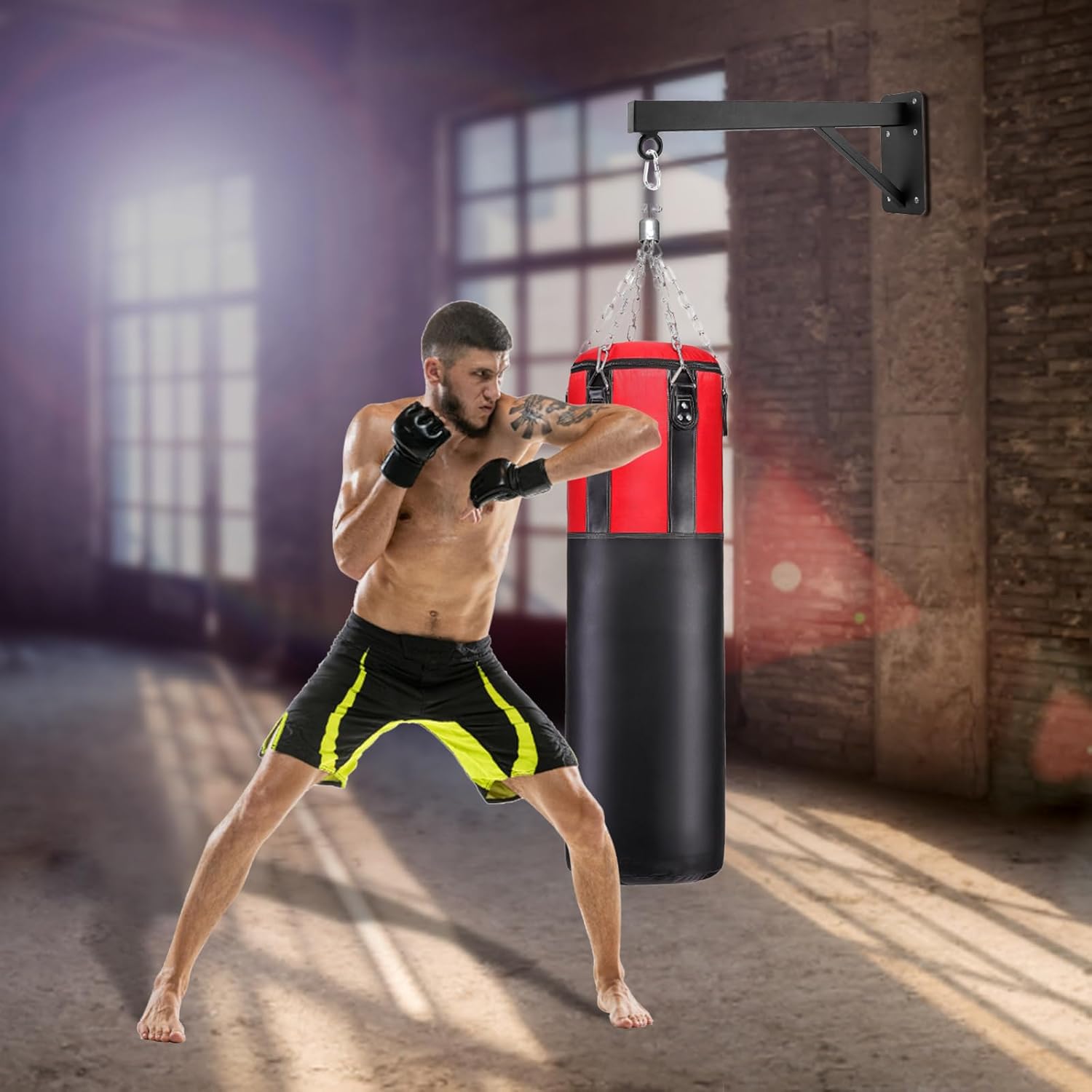 551lbs Load Capacity Heavy Punching Bag Wall Mount HangerSpecificationColor: BlackStyle: ModernMaterial: A3 SteelSurface Treatment: WeldingLoad Capacity: About 250kg/551lbsAssembly Required: YesInstallation: Wall-mountedOverall Size: 12x26x60cm/4.7x10.2x23.6inchDiameter of Ring: 1cm/0.39inchProduct Thickness: 4mm/0.16inchGross Weight: 3.3kg/7.28lbsNet Weight: 3kg/6.61lbsPackage Size: 65x27x13cm/25.59x10.63x5.12inchIncluded1 x Heavy Punching Bag Wall Mount Hanger6 x Expansion Screws1 x Heavy Duty CarabinerNotes1. Please confirm whether the wall is firm when installing.2. Please allow the slight color difference caused by the shooting light and 1-3cm error due to manual measurement, and make sure you do not mind before orderingHow to Install1. Mark the holes with a pencil.2. Bore a hole with a 14mm/0.55inch drill bit.3. Drive the expansion screws into the wall.4. Install the bracket and tighten the expansion screws.