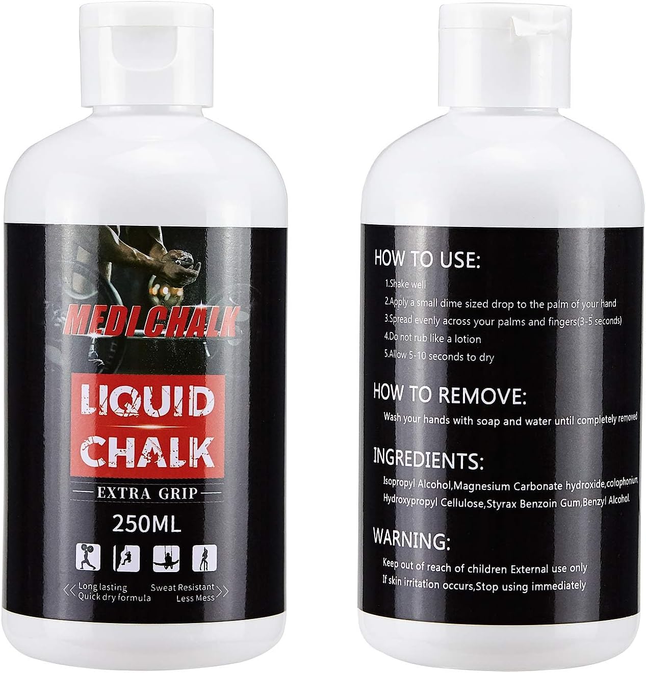 Liquid Training Chalk is a necessity for all kinds of athletic/grip based training! WHY LIQUID CHALK? Unlike regular lifting/training chalk, lasts longer than regular chalk. The constant gripping and re-gripping of barbells or equipment during training causes regular chalk to progressively wear off after a few sets (personally experienced this for years). Simply put, Depending on how long you train for, 1 re-application during an extremely long workout might be necessary, As you might have experienced...The use of regular chalk in gyms is frowned upon by staff because of the mess it can leave not only on the floor but on the barbells. Ingredients: Magnesium carbonate,thickener Diresctions for use: shake bottle hard.Put a coin-sized dollop on your palms and gently spread on your palms and fingers.Allow to dry fully.replace lid after use. vital information: Dont apply to unbroken skin or near the eyes Test liquid chalk on a small patch of skin.In the vent of an adverse reation. cease use immediatly.Do not take internally.after use,wash off with warm soapy water.store out of reach of Children.