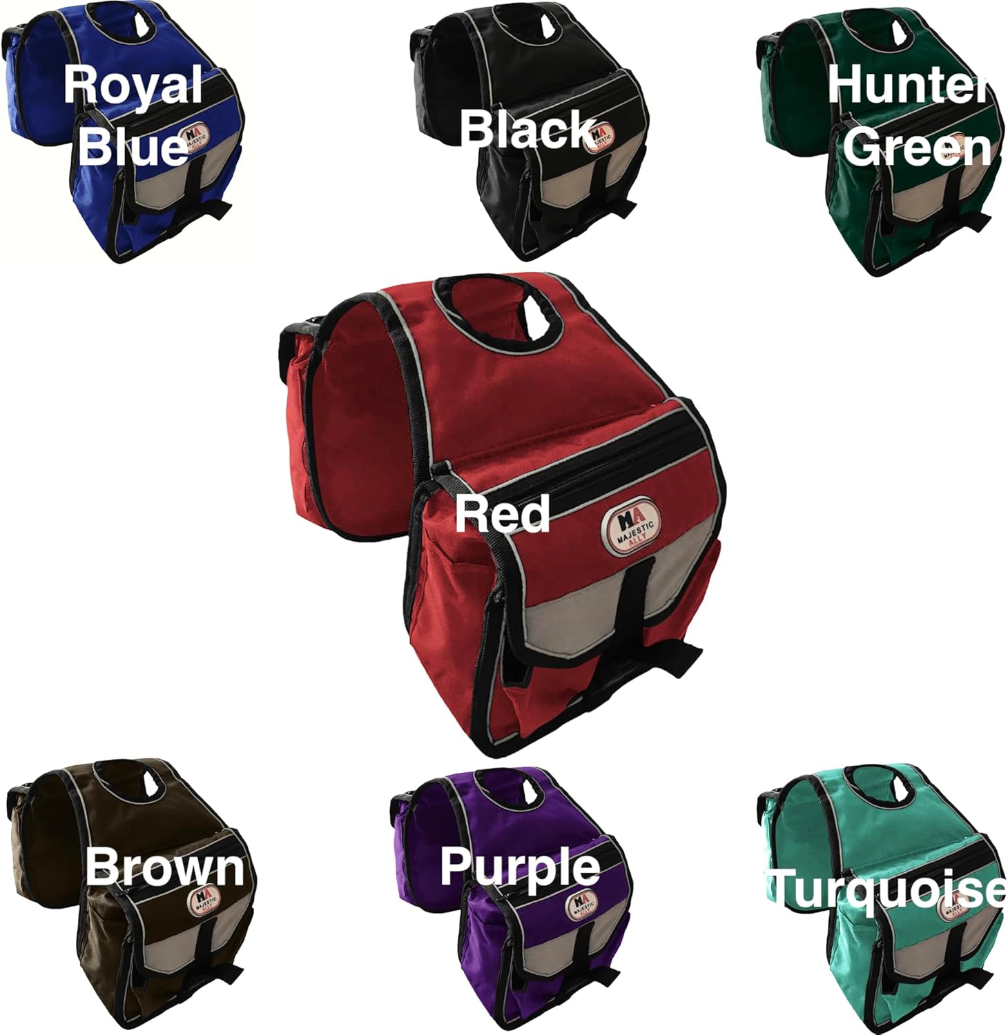 Experience unparalleled convenience on your equestrian adventures with the Majestic Ally Horn Bags. Meticulously constructed from double-stitched heavy-duty 1000-denier polyester, these saddlebags are a testament to durability and reliability. Designed with versatility in mind, the bags effortlessly fit large horn openings and hornless saddles, offering adaptability for various riding setups. The machine-washable feature simplifies maintenance, and the removable liners, requiring hand wash, ensure a thorough cleaning process. Each pocket, measuring 8"H x 8"W x 4"D, provides ample space for your essentials, making these bags perfect companions for long day rides. Additional 6"Hx3"W fabric pockets on each side allow convenient access to smaller items, while 6"Hx4"W mesh pockets cater to bottles or cans. The innovative design of the Horn Saddle Bag ensures it curves forward, staying clear of your legs during rides. It comes complete with a removable and washable insulated liner, a reflective padded pocket for added safety, and two extra side pockets designed specifically for bottle carriers. Ride with confidence, knowing your belongings are secure and accessible with the Majestic Ally Horn Bags, a fusion of practicality, durability, and thoughtful design for the modern rider.