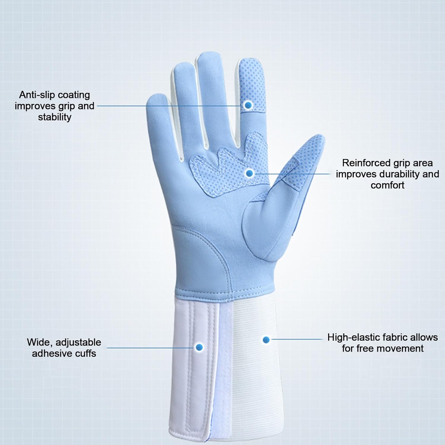 Product Features- Anti-slip drip design for better grip and to prevent slippage.- Reinforced grip area for increased durability and comfort.- High-elastic fabric with widened adhesive cuffs for adjustable fit.- Suitable for various fencing training programs, meeting the needs of different fencing disciplines.- Microfiber fabric protects hands from water and sweat.- Effectively reduces the risk of hand injuries, allowing for worry-free training.SpecificationsProduct Type: Fencing GlovesMaterial: Knitted FabricSizes: #4.0, #4.5, #5.0, #5.5, #6.0, #6.5, #7.0, #7.5, #8.0, #8.5, #9.0, #9.5, #10.0, #10.5, #11Applicable Hand: Right HandPackage Contents1 x Fencing Gloves