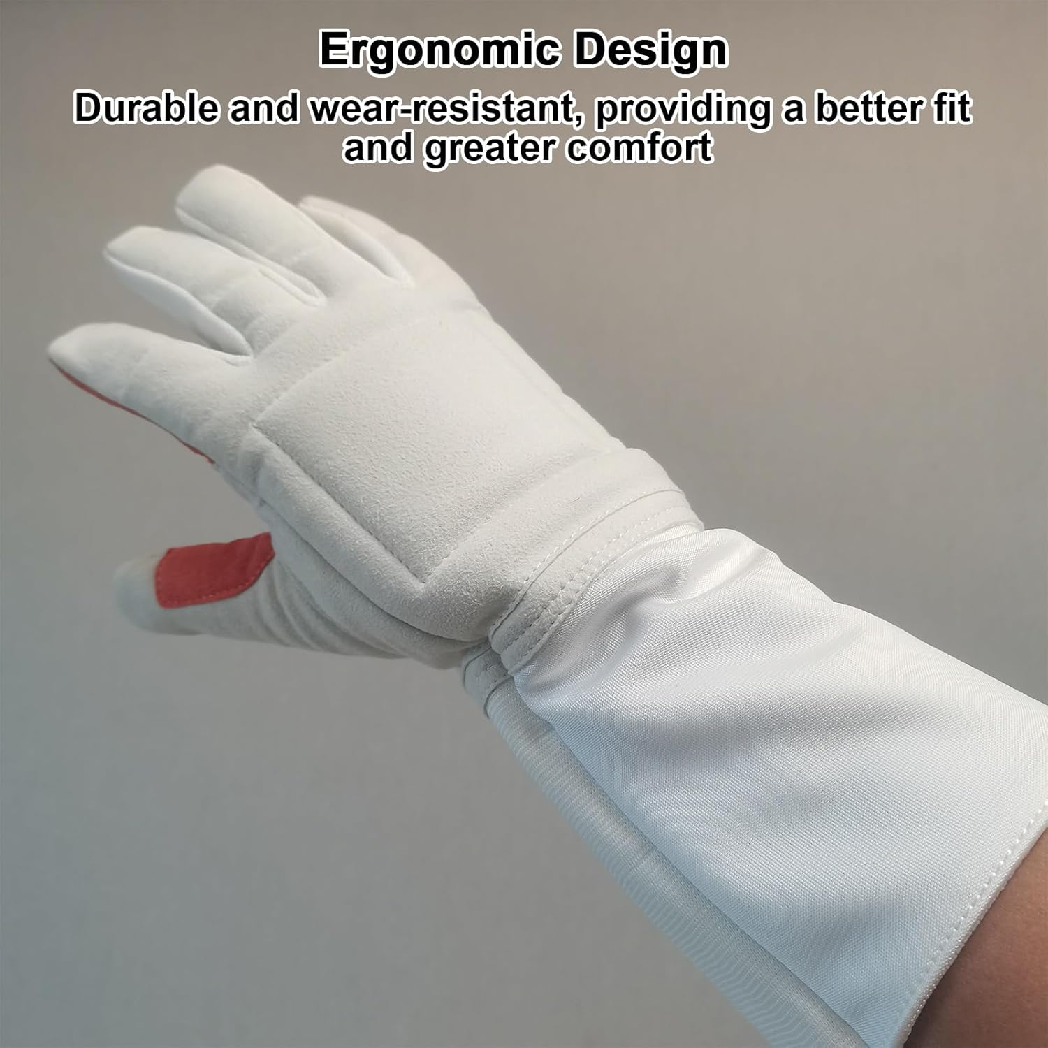 These ergonomically designed fencing gloves, made of PU and breathable fibers, offer excellent grip and comfortable breathability. The 3D contouring reduces hand fatigue. Adjustable cuffs ensure a snug fit. Right-handed and available in a full range of sizes, they are ideal for both training and competition.Measurement MethodPlease use a soft measuring tape to measure the circumference of your palm. After measurement, refer to the size chart to select the appropriate size.- Anti-slip textured palm surface for a stable and flexible grip when wielding the sword- Three-dimensional hand design for a better fit and reduced hand fatigue- PU material combined with breathable and durable fibers keeps hands dry- Adjustable cuffs for comfortable wear and free movement.Specifications:Material: PU + breathable fiberSizes: #6.0, #6.5, #7.0, #7.5, #8.0, #8.5, #9.0, #9.5, #10.0, #10.5Package includes: 1 * Right-hand fencing glove