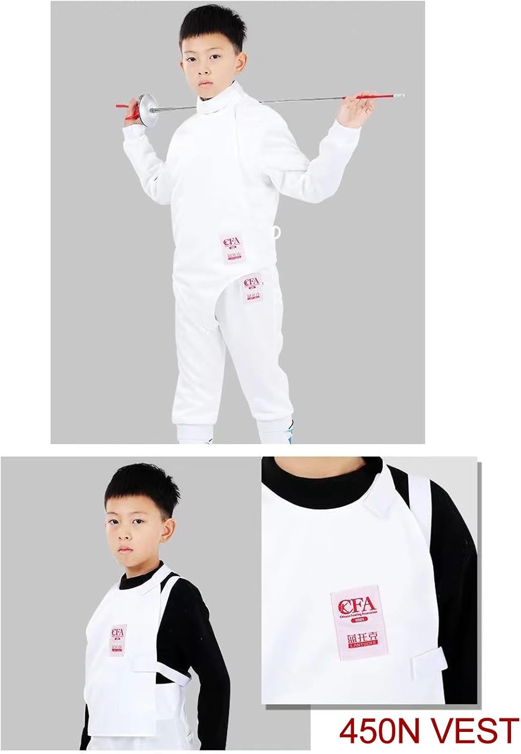 WRYSQBHJYB makes your life better, regardless summer or winter!Our fencing uniform suit provides many sizes, suitable for most fencing athletes.Please refer to the size chart in the pictures before choosing a size. If you are not sure of your size, please contact me at any time, and I will recommend the appropriate size for you.Product parameters:Set contents: top/pants/vestApplicable sword types: foil/epee/sabreSpecifications: children's/adult sizeStab strength: CFA450N, suitable for competitionProduct size: 38-60#