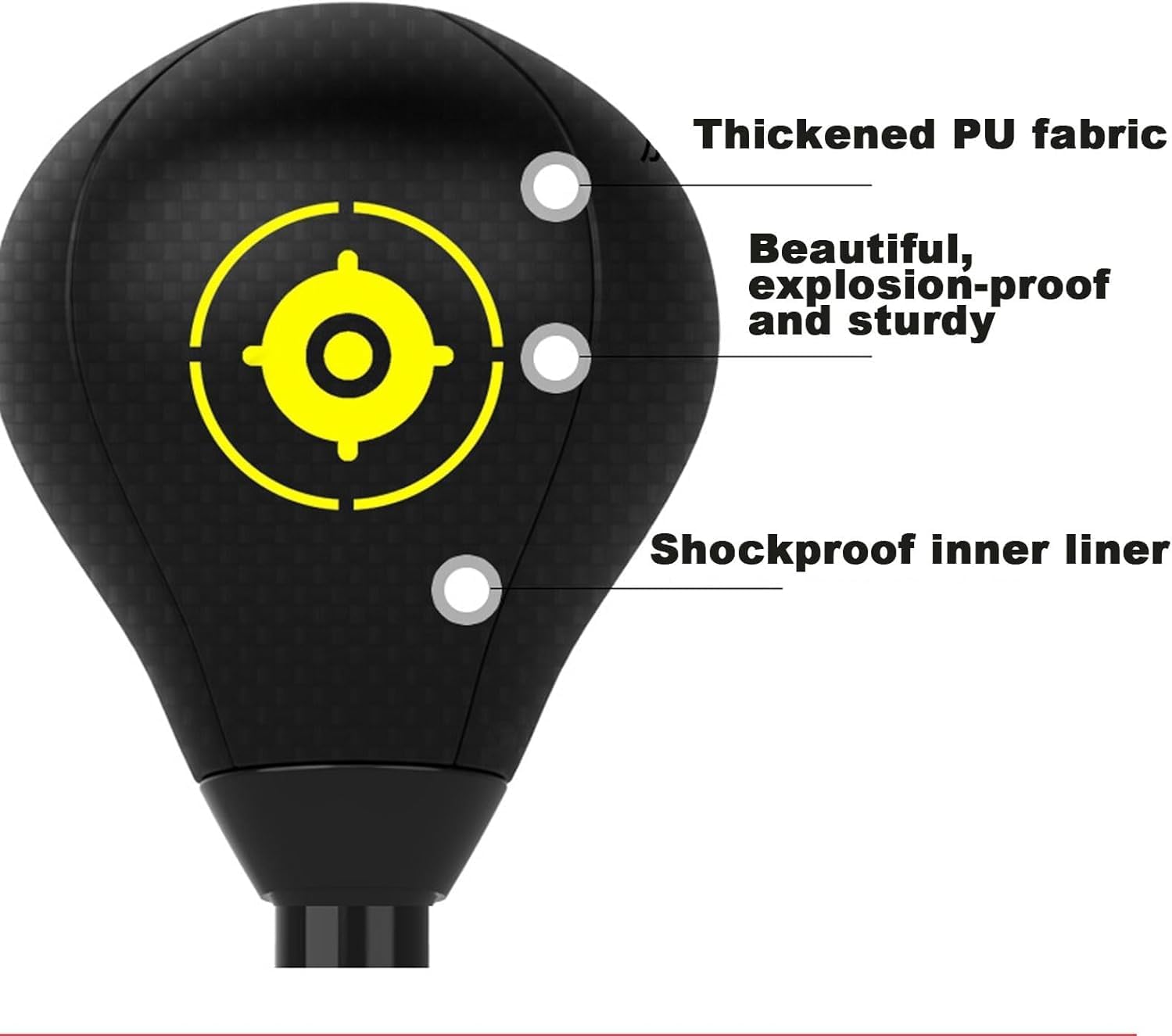 Whether you are a beginner or an experienced boxer, this boxing target provides a tailored training solution to help you improve your punching speed, reaction time and hand-eye coordination Material: PU Color: Black Number of suction cups: 14 Adjustable height: 1.4m~1.77m Weight: about 8KG Applicable floor materials: tiles, bricks, wooden floors, cement floors, etc. Package Contents: Boxing Speed Trainer*1