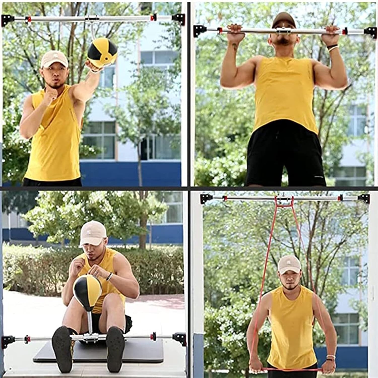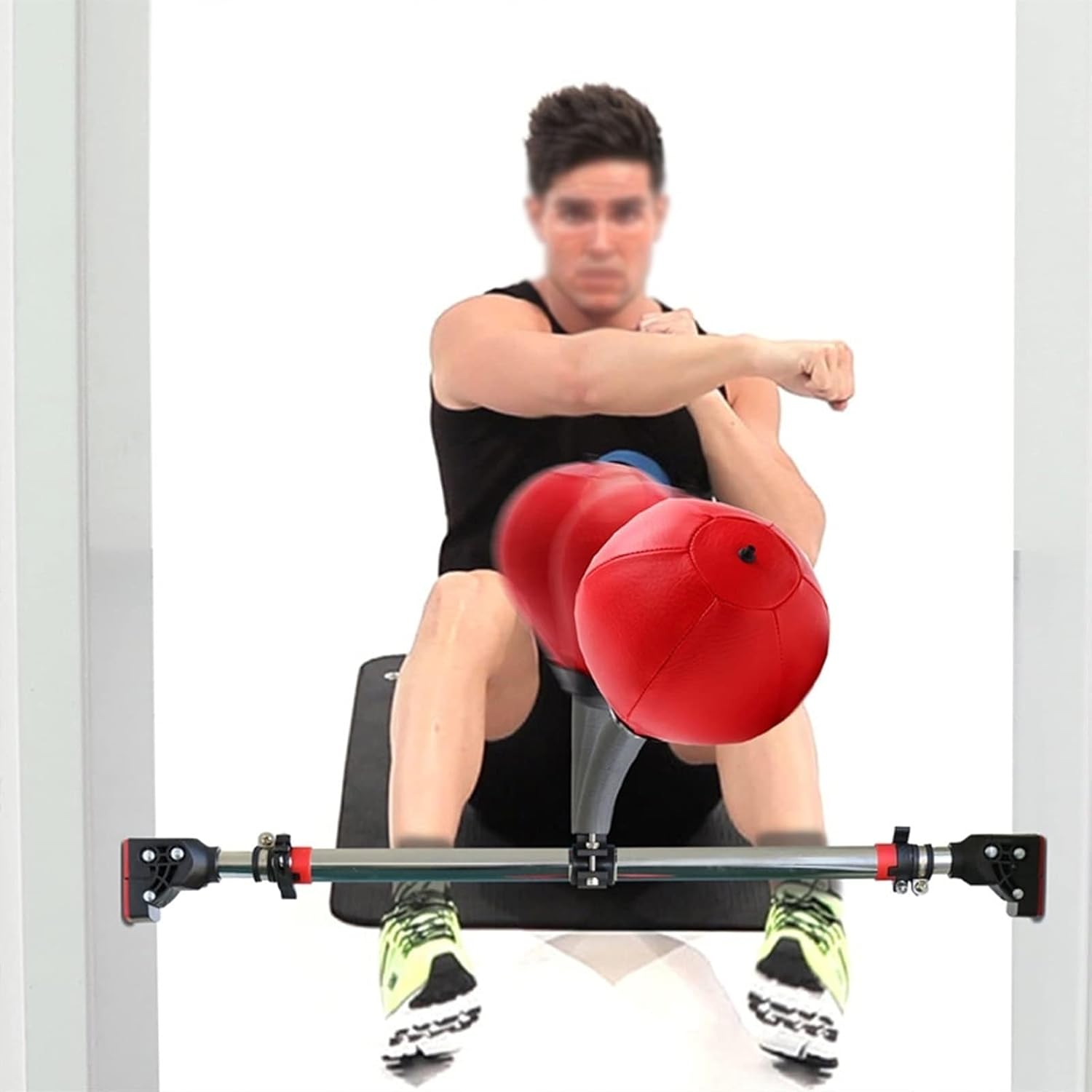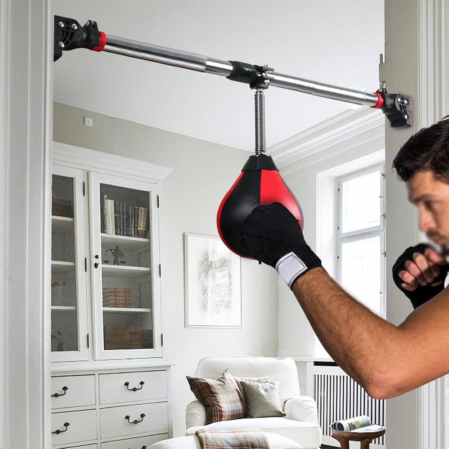 Hanging Boxing BagA funny way to train coordination and reflexes.The boxing bag makes a great gift idea for boxing athletes and home workout enthusiasts of all ages. When you are unhappy or want to vent, the boxing bag is a good choice, it will take away your unhappy emotions.【Specifications】:1. Material: PU Ball + High Elastic Spring + Steel Stand2. Color: Black, Red3. Ball Height: 22cm(8.7")/ 30cm(12")4. Adjustable Stand: 93-103cm(36.6"-40.6")【Features】:1. Made of high quality leather construction.2. WIth adjustable double end stand.3. Adjust the tension for what you need, it builds accuracy and speed.4. The cross bar can be installed where you want to install, the width is adjustable: 93-103cm.5. It has a nice slick look and a satisfying feeling when hit.6. Punch bag is compact, lightweight, and easy to carry.【Package Contents】:1 × Speed Bag1 × Training Pull-Up Bars 1 × High Elastic Spring 1 × Pump(Fittings included )【Note】:- Do not inflate the speed bag too full.When deflating, remove the inflation head and insert the inflation port to deflate.- Before each use, check whether all screws are loose, please tighten them before use.- There may be an error of 1-3 cm due to manual measurement.- There may be chromatic aberration due to the difference between the recording lamp and the display. Please refer to the actual product.