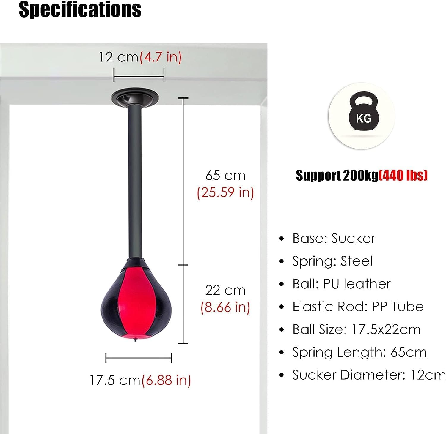 【Description】· Punching ball training allows you to instantly release the pressure accumulated during your day's work and quickly relax yourself. When you feel Frustrated or anger, you can hit it to vent your dissatisfaction, which will make your life smoother.【Specifications】· Base: Sucker.· Spring: Steel.· Ball: PU leather.· Elastic Rod: PP Tube.· Load: 200kg/440 lbs.· Ball Size: 17.5×22cm/6.88x8.66 inch.· Sucker Diameter: 12cm/4.7 inch.· Total Height: 65cm/25.6 inches (from the suction cup to the speed bagtop).【Features】· Close stitch, no worry about leaking.· It is suitable for panels of various materials.· PU surface can protect your hand from injury.· The complete accessories, can be installed soon.· This punching bag can save a lot of space at home.【Package Included】· 1 x Boxing speed ball.【Warm Reminder】· Do not inflate the speed bag too full.· Manual measurement, there will be 1-2cm error, depending on the actual size.· Due to the difference in the display and lighting reasons, there may be a slight color difference between the image and the object.