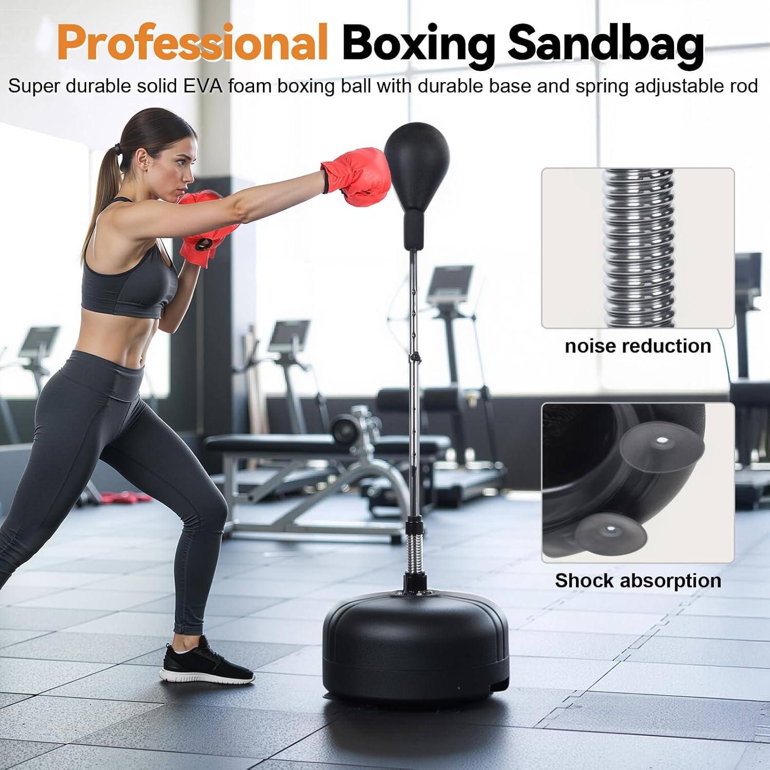 Description:Adjustable Height: The height of this punching bag can be effortlessly adjusted from 47 inches to 61 inches. Whether you're a teenager, adult, or someone over 14, you can quickly find the ideal height that matches your training demands, allowing you to tailor your workout experience to your specific needs.Fast Rebound and Stable Base: Fitted with a powerful spring at the base, this boxing punching bag delivers rapid rebound after each strike, ensuring seamless and continuous training. The stable base, featuring suction cups and the option to fill with water or sand, keeps the bag steady on surfaces like tiles, wood floors, or concrete, providing a safe and stable training environment.Sturdy and Reliable Construction: Engineered for longevity, the boxing equipment utilizes thickened steel pipes for structural support and high-density ABS plastic with a EVA foam ball to ensure the punching bag stays reliable and damage-free even after thousands of strikes.Included Boxing Gloves: Our punching bag set comes with included boxing gloves, making it ready to use right away. The simple installation process means you can start your training session promptly, whether you want to relieve stress, enhance fitness, or train for MMA. The gloves offer essential protection and comfort.Item Name: Punching BagMaterial: ABS PlasticFeatures: Easy Assembly, Fast Rebound, Height AdjustableSize Details:L: 48cm/18.9", W: 48cm/18.9", H: 155cm/61.02" (Approx.)Package Includes:1 x Boxing Ball1 x Punching Bag Bracket1 x Base1 x Mounting Accessories2 x Boxing Gloves