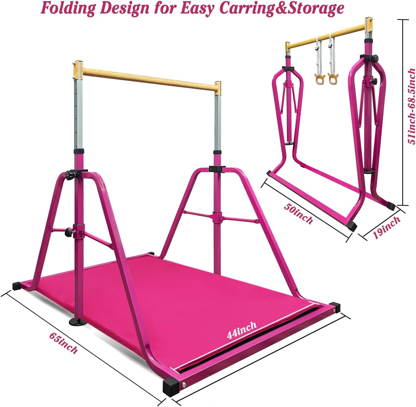 GLANT Excellent Gymnastic Bar Brand Improved structure and heavy metal base build a safe and professonal kip bar!!! 1 Adjust to your desired height The adjustable height (from 3’ to 5’ with 7 levels) makes it perfect for users of any age and height. 2 Stainless steel regulating arm Sturdy, durable and 100% rustproof,wider long feet and thick round support safeguards your kids for 100% security 3 Durable and Strong bar 300 Pound Weight Limit iron Bar 4 Powder coated metal surface High quality paint will stay shiny for years,not as the cheap and pungent smell paint. GLANT kip bar could accompany your kids on the process of growing and training. 1.Strengthen crureus and muscle 2.Improve body' balance force and flexiblity 3.Help to build confidence and courage 4.Having fun and enjoying the childhood fun Choosing a gymnastics bar exhibits huge concern to many, GLANT gymnastic bar is good for beginner at young age, and it will be a perfect gift for your children to pratice their gymnastic skills. Gymnastic Bar Specification Material: Iron, Color Available: Blue / Pink/Purple/Mint Green Height:Adjustable from 3’ - 5’ Assembled Dimensions: 4’Wx4.5’(5.8’ including side feet)Lx(3’-5’)H Weight: 27kg Weight limit: 300 lbs We concerns on the product quality and customer's shopping experience. If you have any suggestions or ideas for our gym horizontal bar, please let us know directly, we care about the inner thoughts of each customer.We will continue to improve our products. If there is any problem with our product, please feel free to contact us. We provide 24 hours friendly email customer support for you. Any quality problem will be refund or replaced.