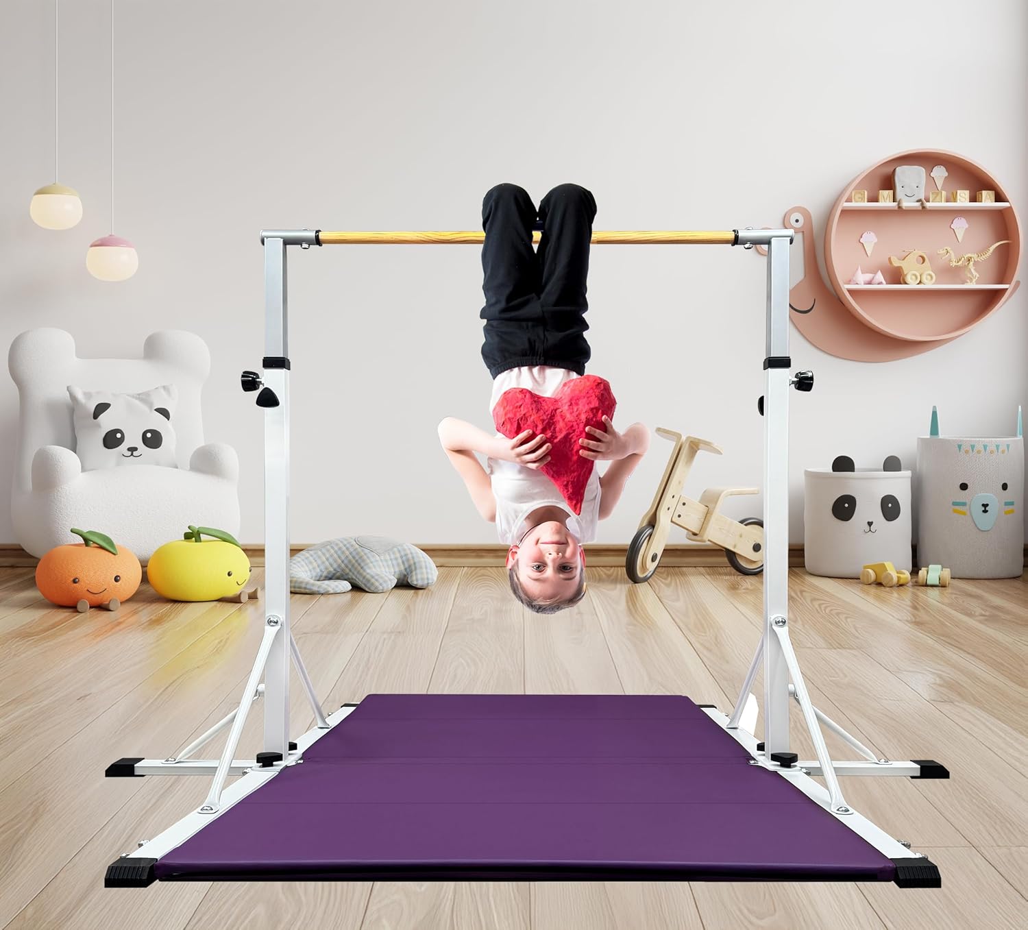 Professional Gymnastics Bar – Sturdy, Safe, and Perfect for Training This professional-grade gymnastics bar is designed for kids and teenagers aged 3 to 20 years, supporting up to 300 lbs. With a 5ft length, 4ft width, and an adjustable height from 42” to 63”, it provides the perfect training space for young athletes to practice at home or in a gymnastics club. Whether your child is a beginner or an advanced gymnast, this bar adapts to their needs, offering a safe, stable, and durable training experience. -Exceptional Stability & Safety Features Engineered with three reinforced middle connections, this bar ensures superior lateral stability, preventing side-to-side wobbling. Unlike bars with fewer connections, this design significantly improves safety and reliability. Additionally, the six large triangular reinforcements and six-point support system provide maximum balance, keeping the bar firm and secure during even the most intensive workouts. Parents can feel confident that their child is training on a strong and secure structure. -Heavy-Duty Steel Construction for Long-Lasting Performance Built from thicker, heavy-duty steel, this gymnastics bar is made to last. Its powder-coated finish resists rust and corrosion, ensuring long-term durability. The reinforced welding points prevent cracking or structural weakness, making it a safe and reliable option for continuous use. -Reliable Support We are committed to providing exceptional customer support. If you have any questions or concerns, our dedicated team is ready to assist you. We prioritize your satisfaction and will work with you to ensure a smooth and enjoyable experience with your gymnastics bar. Give your child the best training experience with this high-quality, stable, and durable gymnastics bar—a perfect investment for young gymnasts looking to improve their skills with confidence!