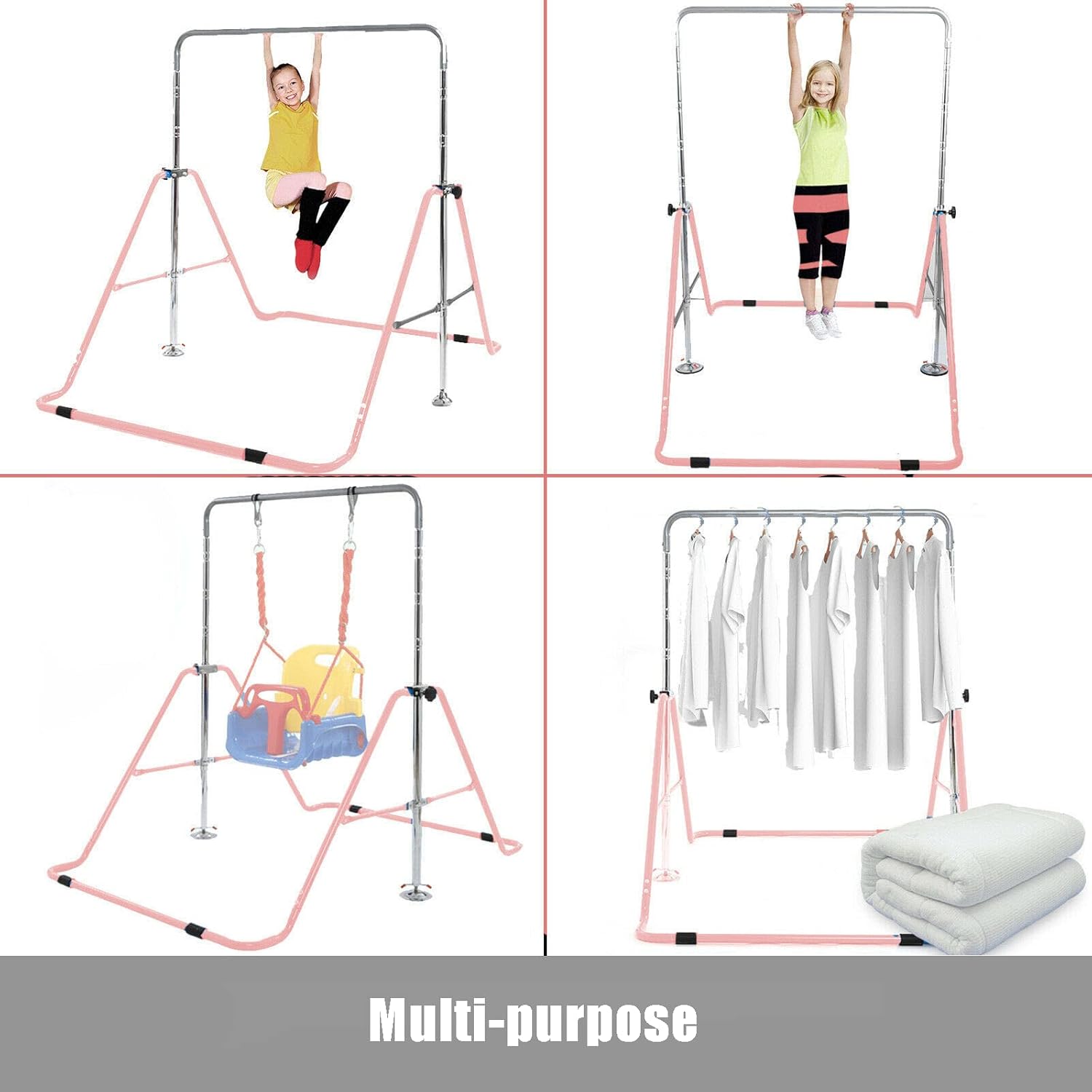 Why use horizontal bars Human bone health has an important relationship with exerciseIn childhood, exercise can promote the growth and development of bones, shape the body, and prevent spondylitisFeatures:Horizontal Bar :This product is suitable for children aged 3-7Children should play with the balance bar accompanied by an adultMake sure that the jungle gym balance bar stands firmly before use.Junior Training Bar :The retractable gymnastics pole has 4 adjustable heights: 35.8 inches/41 inches/46 inches/52 inches (91 cm/104 cm/117 cm/132 cm), which can meet different needs and skill levels.Training Monkey Bars :The primary training rod is constructed of heavy-duty steel and has an anti-rust powder coating to prevent scratches2 round bases and 4 non-slip industrial rubber floor rings keep the iron rod stable and prevent sliding.Home Gym Equipment :The Kip training pole is designed for home use and can be folded to save spaceSize (assembly) 57.87" x42.13" x51.97"/147*107*132 CM, size (folded) 39.8"x16.9"/101*43 CM, just pull up the connecting rods on both sides of the wooden rod, It can be folded in a few seconds.Product information:Applicable users: children aged 3-7Material: Smooth powder coating on the surfaceSize (after installation): 147*107*132CMHeight: 91cm/104cm117cm/132cmWeight limit: 110 lbs/50 kgPackage weight: 22 pounds/10KGBox gauge: 102*32*11cmProduct weight: 19.36 lbs/9.5 kgProduct includes:1* Kids Gymnastics Bar