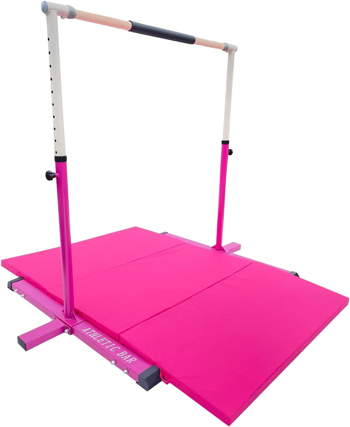 [Full Gymnastics Bar 2 in 1 Training Set] This Gymnastics Kip Bar Horizontal Bar Set Includes a Professional Gymnastic Tumble Mat. This is the Ultimate Gymnastic Training Set that includes the Gymnastic Bar, and 6 FT x 4 FT 2" Thick Gymnastic Mat. The Ultimate Kids Gymnastics Bar Horizontal Kip Bar Set, designed for Gymnastics Training and kid's fitness activities: Hanging, Swinging, Climbing, to develop coordination, improve kids balance, and strengthen the body and core, while increasing flexibility and strengthen the body! [Adjustable Height Levels] 4 Rubber Feet to protect the Floor and for bar stabilization, includes a secure pull pin and turn knob for height adjustment! Assembled Size: L 59 inch x W 54 inch x H 59 inch with 13 Adjustable Heights! The Base is made from Heavy Duty Metal with Stability Side Extensions Base Support that make this Gymnastics Bar Safe, Stable and Sturdy for Beginners and Skilled for Levels 1 to 4 Gymnastic Training [Professional Tri Fold Gymnastics Mat] Includes a Professional Gymnastics Exercise Mat 2" thick [6 feet Long 4 feet Wide] firm high quality firm High Density EPE foam, designed for a cushion soft landing, and a variety of activities and exercises such as Gymnastics, Gymnastics Workouts, Gymnastics Training, Cheerleading, Balance Beam Competition Training and much more! [Safe and Durable] The Kip Bar is Manufactured from the finest Sturdy steel & with a high-quality fiberglass core, with a Pull-down weight limit over 300 lbs! Adjustable and Expandable Levels 3ft to 5ft. Durable, Strong, interactive Hi-Quality Design; Sturdy Bar climbing grip! Strong & Sturdy: Strong Steel Legs, Heavy Duty Rail made from high-quality core with two bottom spreader stability bars! 3 to 5 FT.