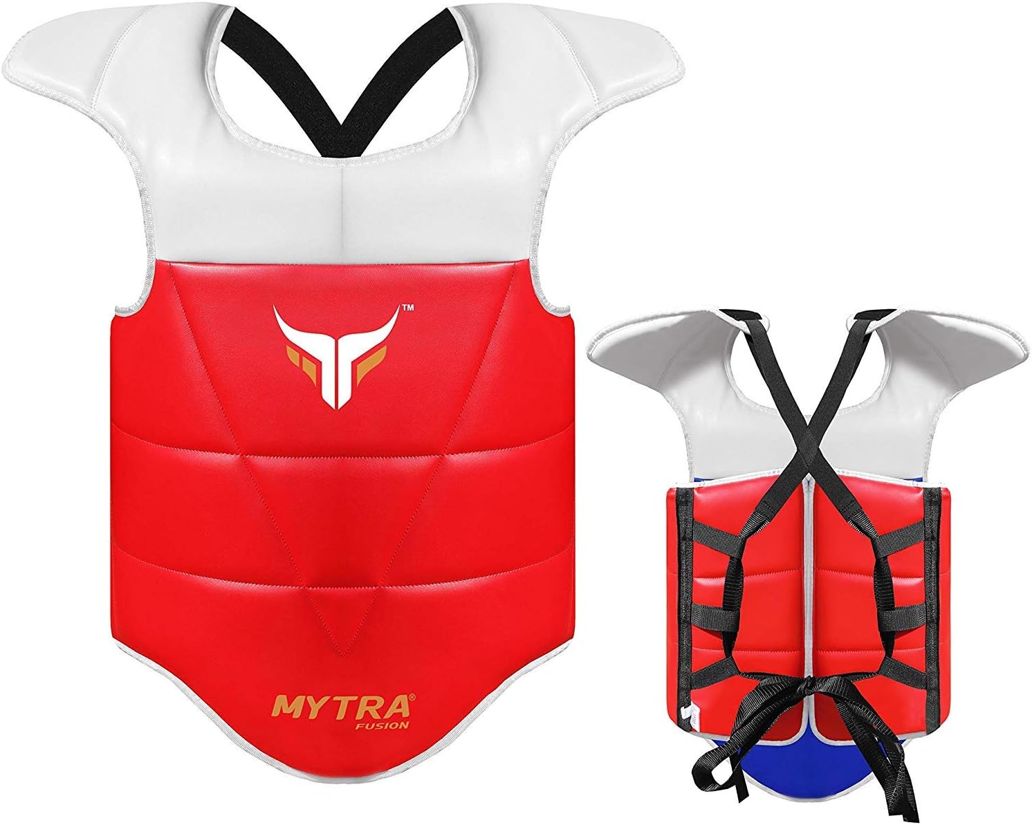 Mytra Fusion Taekwondo chest and belly shield is made of faux leather material.