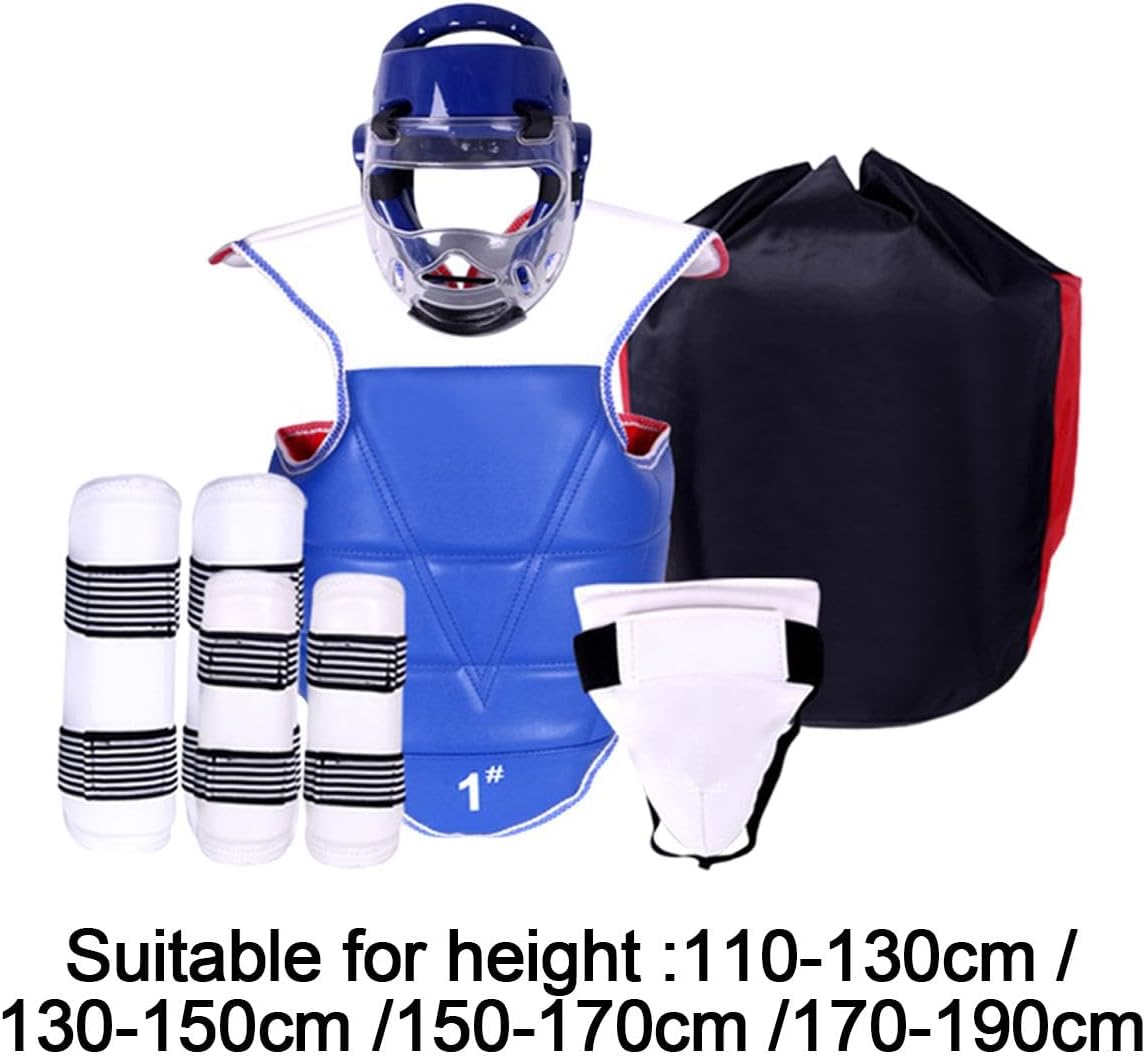 Description: - 【Versatile Use】: This Karate Sparring Gear Set is great for various arts such as Sanda, Muay Thai, Boxing, Taekwondo, competitive sports arenas, fighting, MMA, and Karate. - 【Material】: Made from reliable EVA and PU material that ensures longevity and withstands rigorous training sessions. - 【Taekwondo Sparring Gear Set】: The set includes boxing headgear, face cover, chest pad, groin protector, leg guards, arm guards, and storage bag for easy organization and transport. - 【Ideal for Training】: They are great choice during training sessions in various arts disciplines, designed to deliver the best performance while training and sparring. - 【Comfortable Fit】: Designed with the user's comfort in mind, Karate Sparring Gear Set provides a snug fit without compromising mobility or flexibility during fights or training sessions.Specification: - Material: EVA, PUSize Chart:S: for Height 110cm-130cm/43.31inch-51.18inchM: for Height 130cm-150cm/51.18inch-59.06inchL: for Height 150cm-160cm/59.06inch-62.99inchXL: for Height 160cm-170cm/62.99inch-66.93inchXXL: for Height 170cm-190cm/66.93inch-74.80inchPackage Includes:1 Headgear,1 Face Cover,1Pc Body Protector,1 Groin Protector,1 Pair Shin Guards,1 Pair Arm Guards,1 Storage BagNote:Please allow slightly errors 1-2cm differences due to manual measurement.