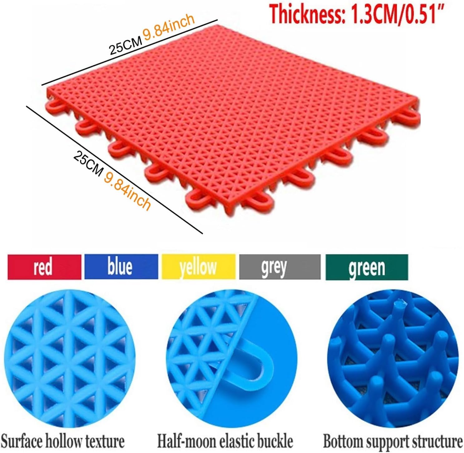 Floor Tiles Floor Mat Transition Strip Protector Mat -- DIY Cutting and Splicing-- Multi-functional drainage floor tiles allow you to cut to any size and shape, can be trimmed with a utility knife to make it fit your area. -- Indoor or Outdoor Use-- Multi-functional modular interlocking cushion floor tiles design for any environment, --Quick Water Drain-- Densely drainage hole design, so that quick water drain, and promotes airflow under the tiles. --Soft & Anti-skid-- Anti-skid advantages can prevent dangerous accidents especially for pregnant woman, the aged, children. Anti-fatigue qualities similar to rubber flooring, soothes and gently massages tired feet. -- Easy Installation -- Simply snap together the tiles and create custom configuration on site. No tools or glue needed. Can be assembled or disassembled for storage or easy transportation. -Easy to Clean-- Simply hose down the floor and let the self-draining design allow for the dirt and debris to be swept away. Cleanup with a scrub brush and soap when use it for a while. The tiles can easily be taken up and reinstalled if deep cleaning is necessary. ? Specifications: Material: PP Size( Each tile): 25x25cm/9.84x9.84 inches Shape: Square With lock-in system Color: Blue , Gray , Green , Red , Yellow Package Included: 12/16 pcs Splicing Soft mats