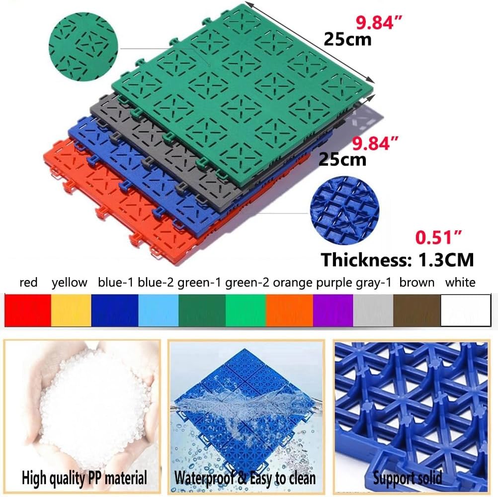 We provide design s. -- Indoor or Outdoor Use-- Multi-functional modular interlocking cushion floor tiles design for any environment, UV resistant for indoor or outdoor applications. --Soft & Anti-skid-- Anti-skid advantages can prevent dangerous accidents especially for pregnant woman, the aged, children. Anti-fatigue qualities similar to rubber flooring, soothes and gently massages tired feet. -- Easy Installation -- Simply snap together the tiles and create custom configuration on site. No tools or glue needed. Can be assembled or disassembled for storage or easy transportation. -Easy to Clean-- Simply hose down the floor and let the self-draining design allow for the dirt and debris to be swept away. Cleanup with a scrub brush and soap when use it for a while. --Quick Water Drain-- Densely drainage hole design, so that quick water drain, and promotes airflow under the tiles. -- Satisfaction Guarante-- We guarantee the quality inspection of each product before leaving the . We have a professional team to provide you with the best . If the product does not meet your expectations, please contact me as soon as possible and ? Specification: Material: PP Size: 9.84 x 9.84 inch/ 25 x 25 cm Thickness: 0.47inch/ 1.2 cm Shape: Square