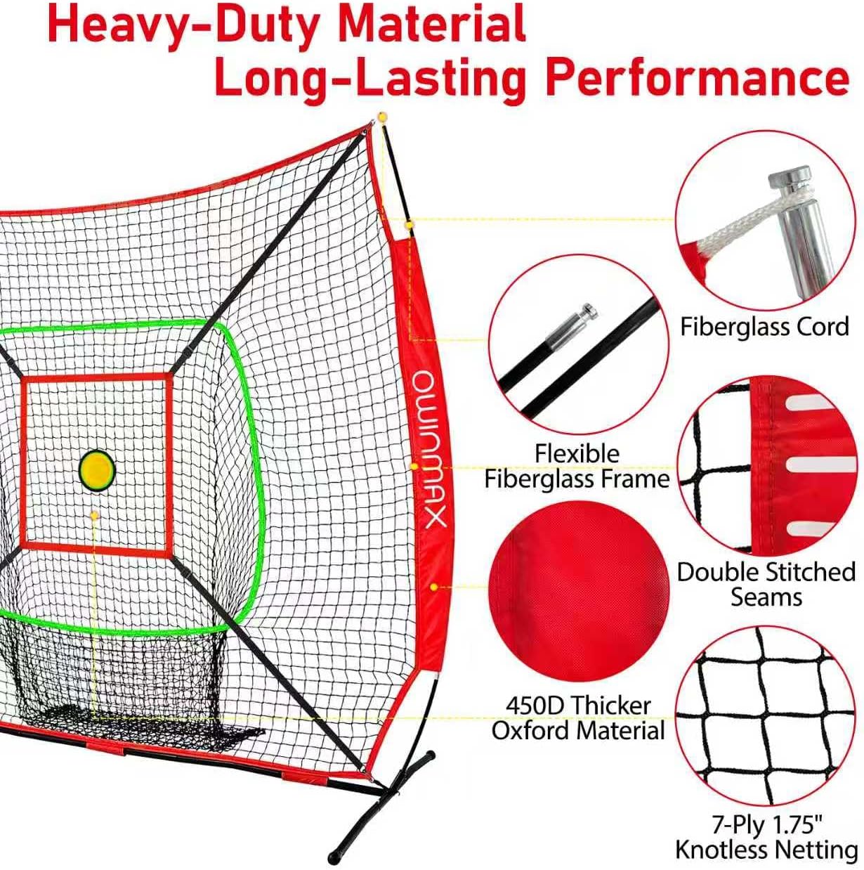 DIMENSIONS: Large 7x7 feet baseball practice net provides ample coverage for batting and pitching practice, featuring a built-in strike zone target for precision training. ADJUSTABLE DESIGN: Height-adjustable batting tee allows players of different sizes to practice their swing mechanics and perfect their hitting technique. PORTABLE SETUP: Quick assembly and breakdown design with sturdy frame construction, making it easy to transport and store when not in use. TRAINING FEATURES: Includes circular target zone and marked strike zone for focused pitching practice, plus weighted ball for power hitting drills. VERSATILE PRACTICE: Perfect for both batting and pitching practice, suitable for backyard training, team practices, or indoor facilities.