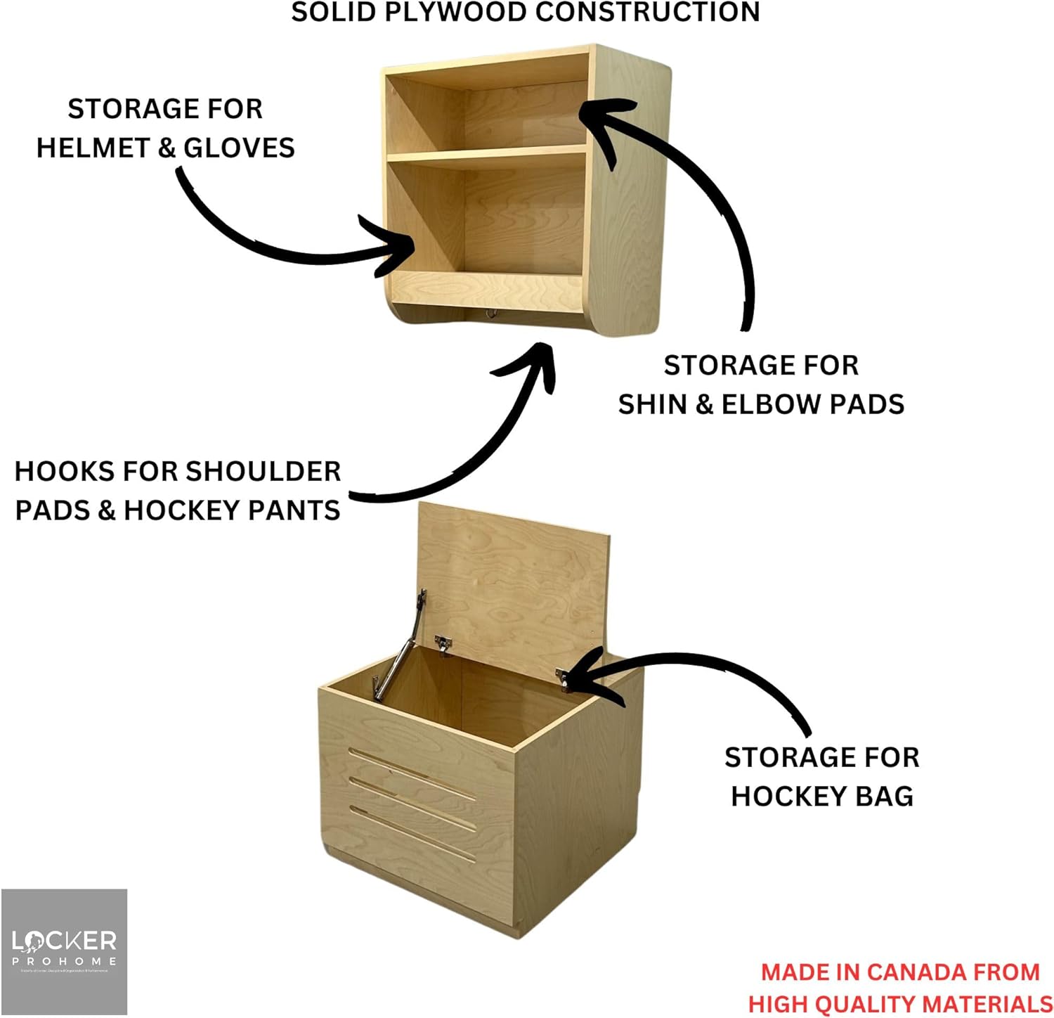 Introducing the Pro Home Locker, the ultimate storage solution for passionate hockey players! Crafted from high-quality varnished plywood in Canada, this durable locker is designed to keep your gear organized and your space tidy. With its sleek design and easy assembly, the Pro Home Locker can be put together by one person in no time, bringing the dream of a personalized storage space right into your home. Every kid who dreams of emulating their favorite professional players can now take the first step towards discipline, organization, and peak performance. Make your home the starting point for greatness with the Pro Home Locker - where passion meets practicality. This Storage Locker has several uses. Not only for sports, it can be very useful as a regular storage locker at home or can even adapt very well to a childcare environment.