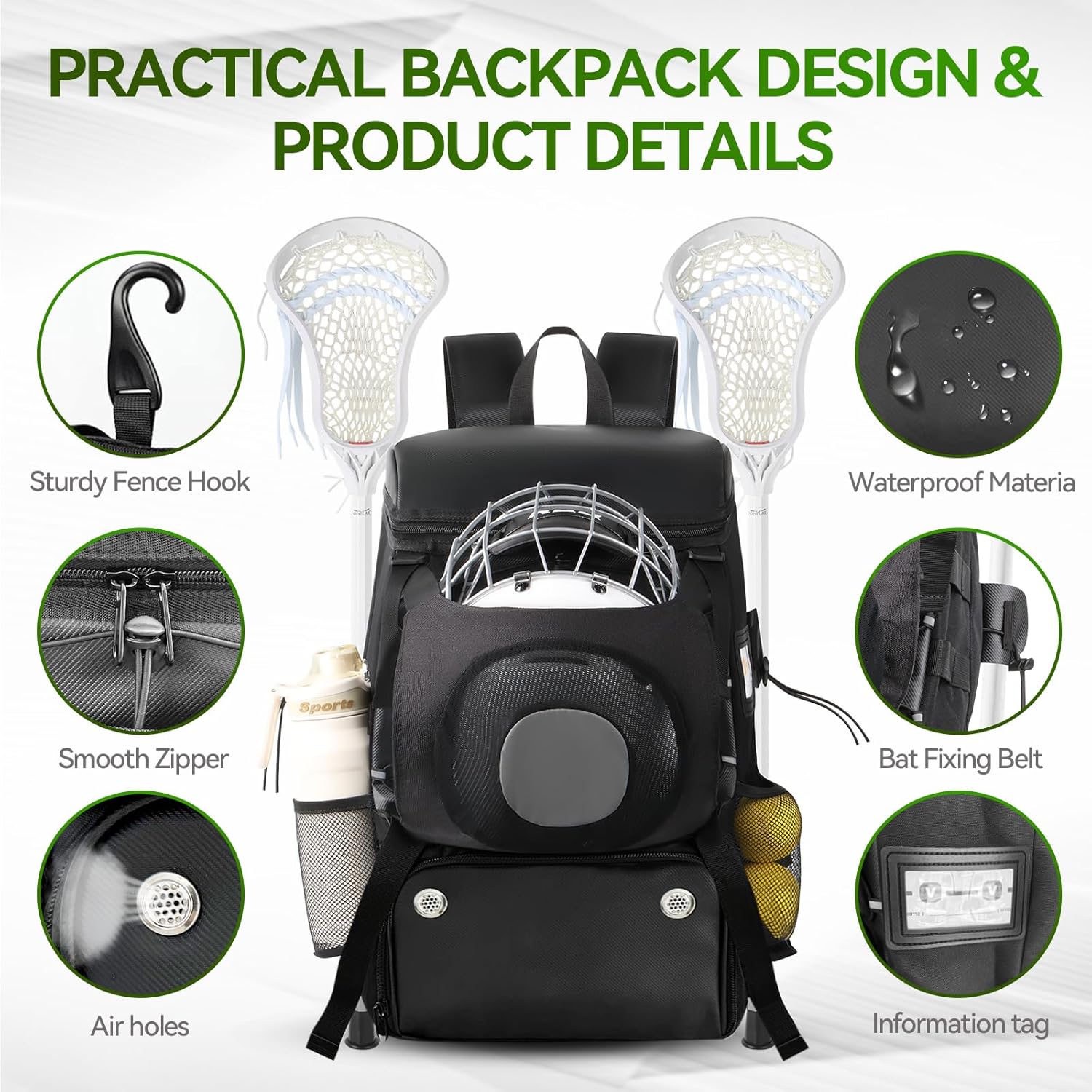• ✅【Multi-Sport Versatility】Perfect for lacrosse, field hockey, goalie gear, soccer, baseball and more. Hidden helmet compartment maximizes storage; side webbing + hooks for hanging gloves/gear; detachable ID slot for easy identification. Due to its large size, it is recommended for people aged 14 and above to use it