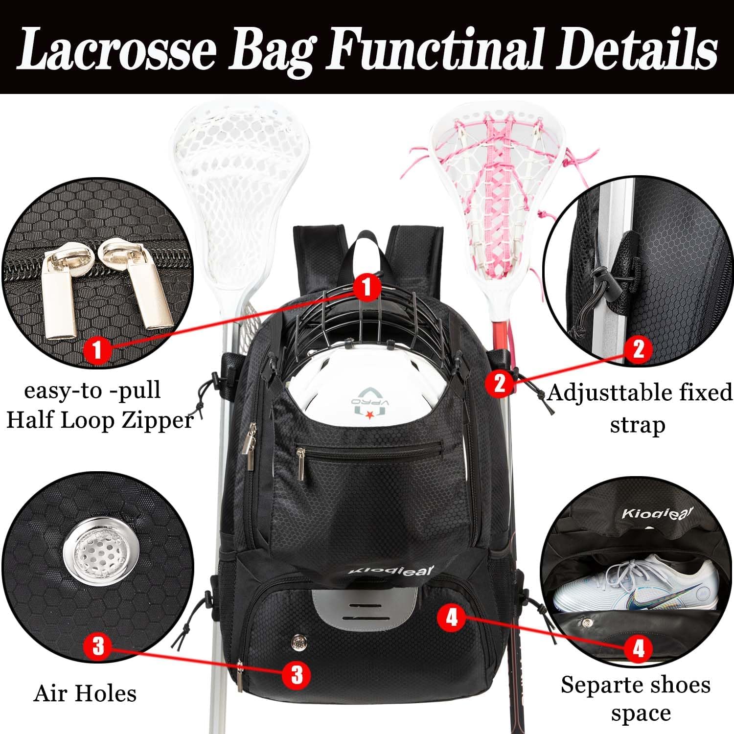 Kioqiear Lacrosse Bag Large Lacrosse Backpack with Stick Holder For Men & Women: 1.Lacrosse Bag Size:19.5" L x 14" W x 10" D 2.Loading Capacity:50 L 3.Over-sized main compartment for equipment 4.2 lacrosse stick holders 5.2 adjustable straps to hold helmet on front of bag 6.Mesh pockets with drawstring works well to secure the bottle. 7.Fence hook allows the lacrosse backpack to be hung anywhere. 8.Ergonomic backpack straps & air mesh padded back with adjustable sternum strap and hip belt