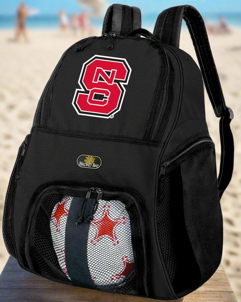 This OFFICIAL NCAA Broad Bay NC State soccer backpack or NC State Wolfpack volleyball bag is the perfect solution for soccer or volleyball practice. The Broad Bay NC State soccer backpack bag is made of heavy duty 600 Denier Fabric with a waterproof backing. The mesh paneled interior ball compartment allows you to quickly and easily zip your ball right in and keep it separate from the main compartment. The main compartment of this great NC State Soccer Backpack or Volleyball bag measures approximately 10” x 13” x 9” after the ball is inside and still has plenty of room for your shin guards, cleats, and a change of clothes. Two zippered side compartments with mesh panels allow you to keep your water bottle in one and your keys and cell phone in the other. This NC State soccer backpack or NC State Wolfpack volleyball bag features adjustable padded shoulder straps, hand strap and dual zipper pulls on both the main compartment and the ball compartment. The base is 16in x 8in not including pockets. This great NC State soccer or NC State Wolfpack volleyball backpack measures 18" high. ** Official NC State Wolfpack Soccer Bags & NC State Volleyball Bags- Up to 12% Returned To Support NC State Programs!