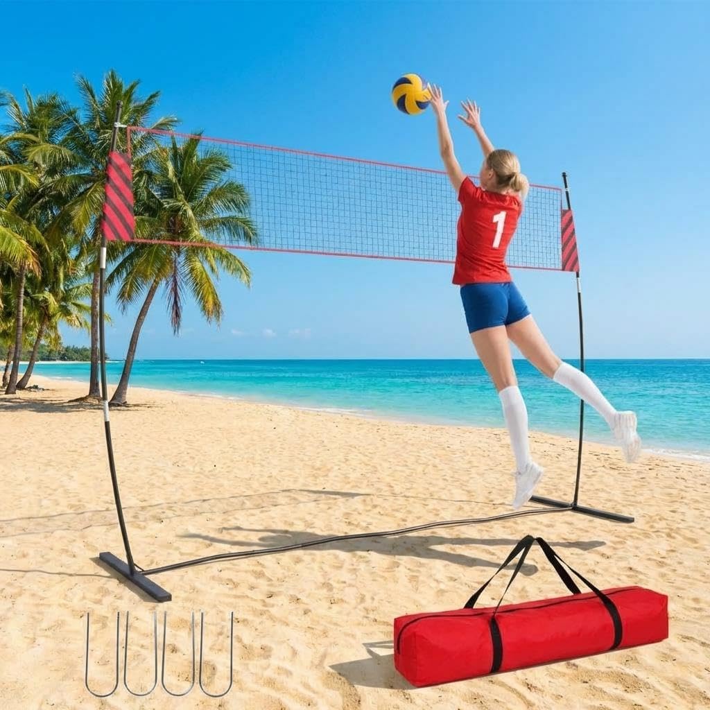 Ready to turn any backyard, beach, or park into your personal volleyball court? Imagine the fun and excitement of a spontaneous game with friends—just set up, adjust, and start playing anywhere, anytime!Highlights at a glance:Height adjustable for family games and professional volleyball trainingDurable anti-tear net and weather-resistant steel base for year-round playQuick and easy setup lets you start playing in minutes anywhereStrong metal tubes ensure stability on backyard, beach, or courtLightweight design with portable storage bag for effortless transportVersatile volleyball net for backyard gatherings, beach days, and school practiceSpecification:Size: 12 ftColor: black redMaterial: iron+peFriendly note:Please avoid hanging or pulling down on the net to prevent damage.Make sure to evenly tension the net before play for best performance.Store the net and poles in the storage bag after use to keep them in great condition.Adjust the pole height gradually and ensure each section is securely locked in place.Packing list:1x Volleyball net1x Portable bag1x User manual