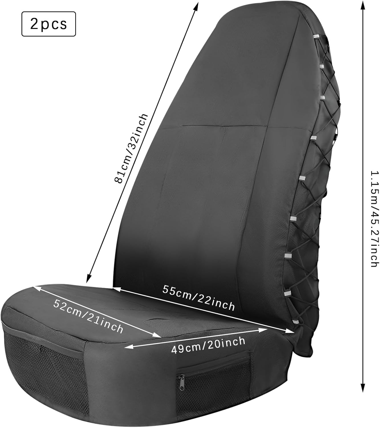 Details Adjustable Side Straps: They make it easy for you to adjust the size of the seat cover according to the seat dimensions and securely fasten the cover so that it doesn't slip off. Precision Stitching: Crafted with high-class sewing technology, it prevents fraying and withstands everyday use. Application It is suitable for most car seats on the market such as cars, SUVs, trucks and vans for all seasons. Specification Color: Black Material: 600D Oxford Cloth, PU Process: Coating, Sewing Style: Modern Assembly Required: No Is Machine Washable: No Number of Pieces: 2 Seat Cover Back Size(W*H):55*80cm/22*31.5in Seat Cover Size: 52*49*81cm/21*20*32in Package Size: 35*23*19cm/13.78*9.06*7.48in Gross Weight: 1.8kg/3.97lbs Net Weight: 1.4kg/3.09lbs Package Included 2*Seat Covers Notes 1.Please make sure the size of this product fits your car seat before purchasing. 2.Please note that this product is not recommended for machine washing. 3.Please note that this product is not suitable for seats with armrests. 4.Please note that the seat should not be oversized, and this product is not suitable for sports seats. Please allow the slight color difference caused by the shooting light and 1-3cm error due to manual measurement, and make sure you do not mind before you order.