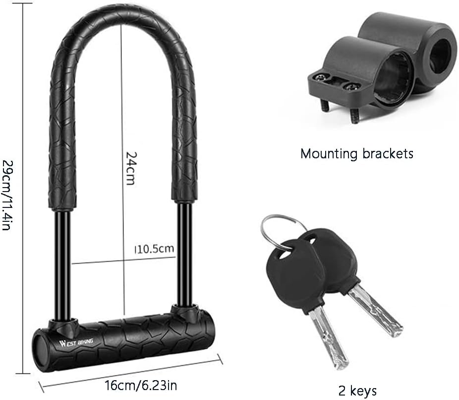 Gorgeous Gift: Looking for a great gift for family, friends, or cycling enthusiasts? This U-lock is the perfect choice, especially for those who need to park their bikes in public places. It’s a gift that’s sure to lock in their appreciation.Product name: lockType of lock: U-lockLock type: Key LockLock body: all solidcolor of the product: blackProduct Size: 16cm/6.23in x 29cm/11.4inItem weight:1111 GFunction: Security lockKeys: Comes with 2 keysApplicable: bicycles, electric vehicles, motorcycles, etc.You will get: 1 lock, 2 keys, a fixed bracketAdded Convenience and Peace-of-Mind: No more stress of being locked out if you lose your primary key. For extra peace of mind, we’ve included two bike lock keys so that you can carry one and keep the spare at home or in the office, ensuring you won‘t be stranded without access to your bike.Wide Applications: Use the bike locks alone or paired with the steel cable--you make the choice! It‘s perfect for securing bicycles, children’s bikes, electric bikes, ladders, barbecue grills, sports equipment, lawnmowers, gates, and more. Make sure to check the size to ensure a perfect fit.