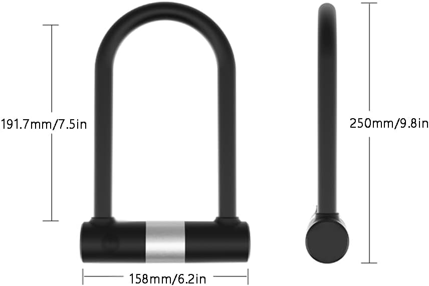 Gorgeous Gift: Looking for a great gift for family, friends, or cycling enthusiasts? This U-lock is the perfect choice, especially for those who need to park their bikes in public places. It’s a gift that’s sure to lock in their appreciation.Product name: lockType of lock: U-lockLock type: Key LockLock body: all solidcolor of the product: blackProduct Size: (158mm/6.2in)(191.7mm/7.5in)(Overall length:250mm/9.8in)Item weight:900 GFunction: Security lockKeys: Comes with 2 keysApplicable: bicycles, electric vehicles, motorcycles, etc.You will get: 1 lock, 2 keys,a fixed bracketAdded Convenience and Peace-of-Mind: No more stress of being locked out if you lose your primary key. For extra peace of mind, we’ve included two bike lock keys so that you can carry one and keep the spare at home or in the office, ensuring you won‘t be stranded without access to your bike.Wide Applications: Use the bike locks alone or paired with the steel cable--you make the choice! It‘s perfect for securing bicycles, children’s bikes, electric bikes, ladders, barbecue grills, sports equipment, lawnmowers, gates, and more. Make sure to check the size to ensure a perfect fit.