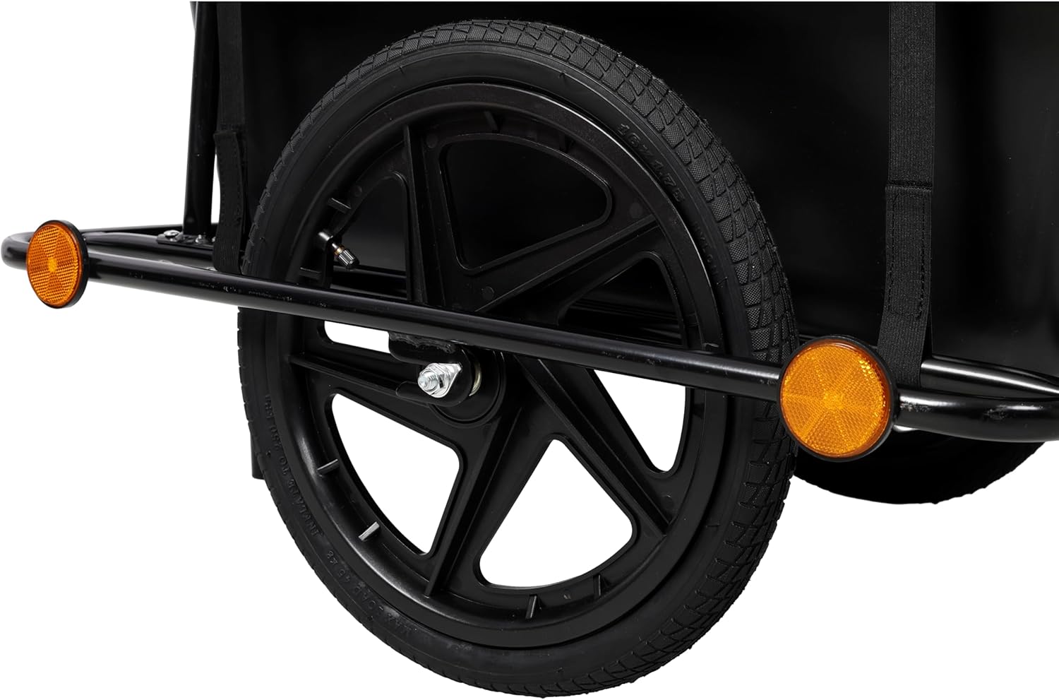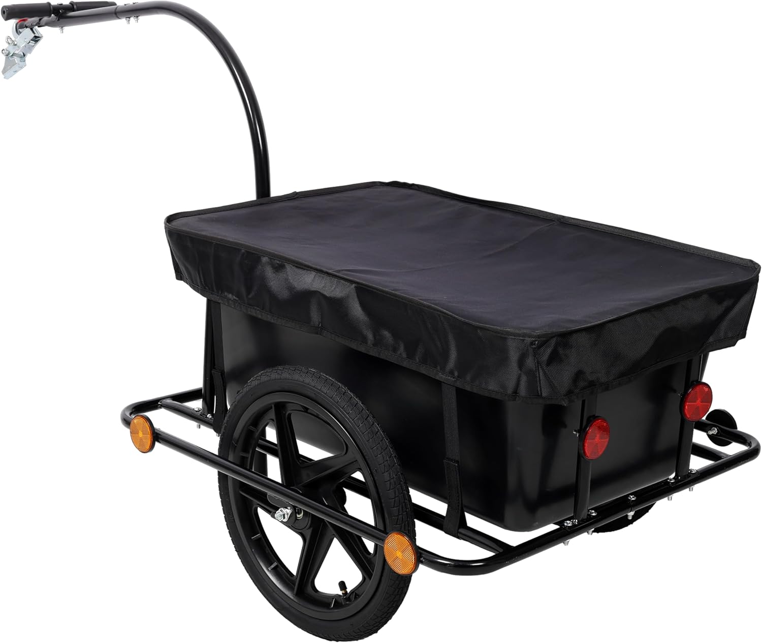 Tired of struggling with heavy backpacks or unbalanced bags while cycling? Our Bicycle Cargo Trailer provides the perfect hands-free solution for transporting groceries, camping gear, or tools with absolute stability and ease. This bicycle cargo trailer is the ultimate outdoor companion, engineered with a heavy-duty powder-coated metal frame and a high-capacity removable storage box. Unlike standard bike wagons, our model features an upgraded Oxford cloth cover with a professional PVC waterproof coating to keep your cargo bone-dry during unexpected rain. The two heavy-duty wheels offer a smooth glide on pavement or trails, while the universal coupler ensures you can hitch and unhitch in seconds without needing a toolbox. Q: Is this bike cargo trailer right for me? A: Yes. This Bicycle Cargo Trailer with Removable Box is designed for outdoor enthusiasts, commuters, and campers. It fits perfectly in suburban streets or park trails, whether you use it for grocery shopping, hauling camping supplies, or transporting DIY tools. Q: Is the capacity right for my needs? A: Absolutely. With its high-capacity storage box and heavy-duty frame, it is large enough to handle bulky groceries and outdoor gear while remaining compact and easy to maneuver behind your bike. It provides a significant load-bearing upgrade over standard bike carts. Q: Is it easy and comfortable to use? A: Definitely. It’s designed with a tool-free universal quick-connect coupler, making it easy to attach or detach from your bicycle. You’ll spend less time dealing with complex setups and more time enjoying the smooth, stable ride and the convenience of extra storage space. Q: Will it match my outdoor setup? A: For sure. With its sleek black finish and professional industrial design, it blends seamlessly with modern mountain bikes and hybrid cycles. It looks professional and rugged wherever your adventure takes you.