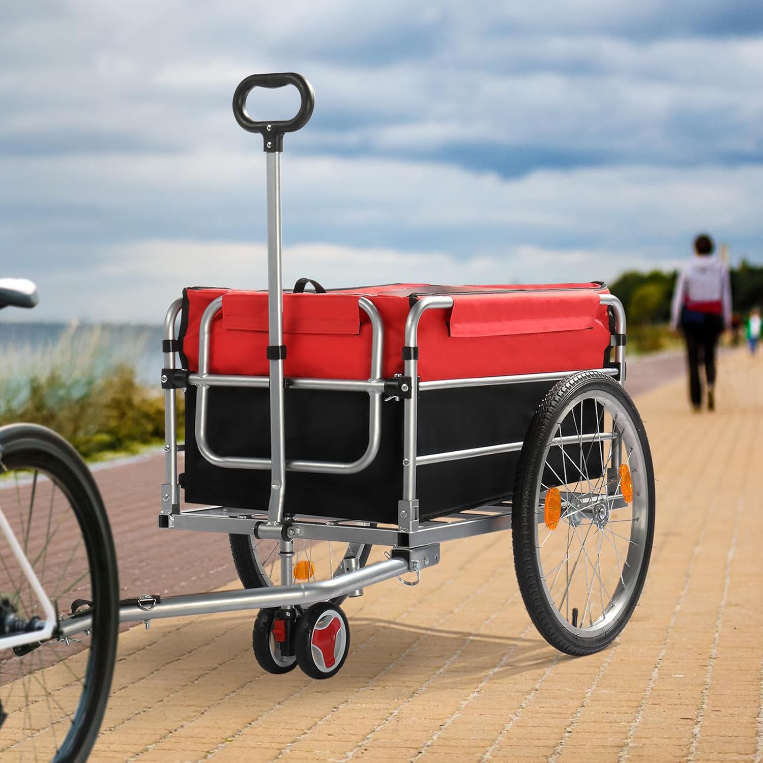 Features:【Maximum Load Capacity】This bike trailer boasts a maximum load capacity of 200 lb, making it perfect for transporting heavy goods such as luggage, plants, tools, or groceries.【Durable Iron Construction】Crafted from strong and hard iron, this bicycle cargo trailer ensures exceptional durability and sturdiness, making it a reliable choice for industrial and furniture construction.【Easy Connection】Equipped with a convenient tow bar, connecting this bike trailer to a bicycle is a breeze, allowing for effortless transportation of goods.【Multipurpose Utility】This versatile bike cart can be used for a wide range of purposes, making it a practical choice for various hauling needs, be it for work or leisure.Specifications:1.Color: Red and Black2.Material: Steel3.Assembled Product Dimensions 37.8 x 22.83 x 29.53 Inches(L x W x H)Package Included:1*trolley1*accessory bag1*instruction manual