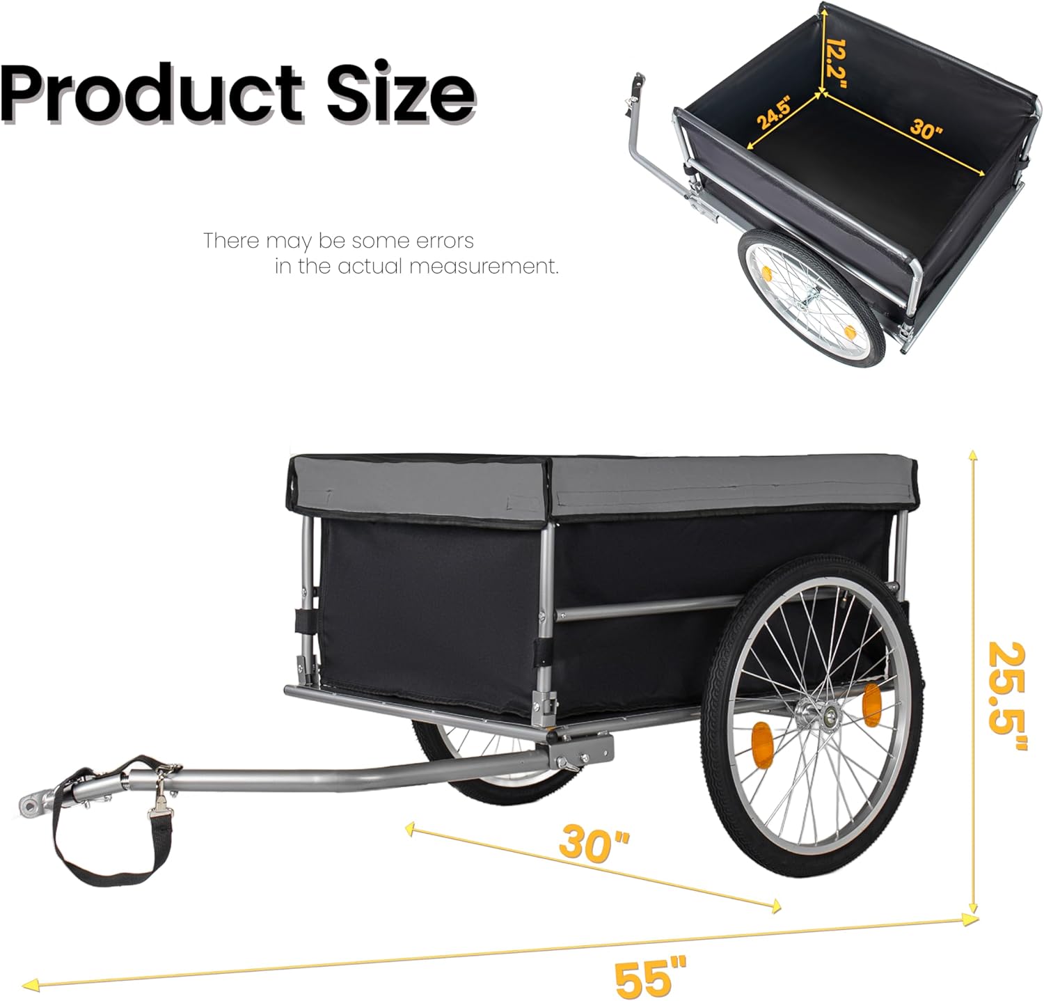 Bike Cargo Trailer, 120 lbs Load Capacity, Heavy-Duty Bicycle Wagon Cart, Foldable Compact Storage with Universal Hitch, Bicycle Trailer with 20 Inch Wheel for Luggage, Tools, GroceriesSpecification:1. Material: Steel2. Color: As product image shown3. Size: 55*30*25.5 InchFeature:Versatile Coupler & Removable Cover: The universal coupler is suitable for most bicycles and is very convenient to use. Besides, the removable cover has a good protective effect and can effectively prevent the internal items from being damaged. In addition, the 600D Oxford cloth cover is durable and allows your goods keeping dry during rainy daysBigger Wheels & Smoother Ride: The bike trailer cargo comes with 20-inch inflatable tires, providing a smooth and effortless ride while keeping your cargo protected from bumps along the way. For added safety, both wheels are equipped with reflectors to enhance visibility during nighttime rides or in rainy conditionsFold It Up & Take It Anywhere: It is designed with a user-friendly folding mechanism. The Sidebar can be easily folded when not in use, and achieve a compact size that's perfect for storage or transportation. Velcro simplifies the installation process and is very sticky.Perfect Bike Cargo Trailer: Our premium bicycle cart is ideal for running errands such as shopping or toting supplies. You can use it to take your pet to a park or party, or to transport tools or groceries. The large capacity allows you to transport many of the items you need without multiple trips.Package Included:1 Set Bike Cargo Trailer