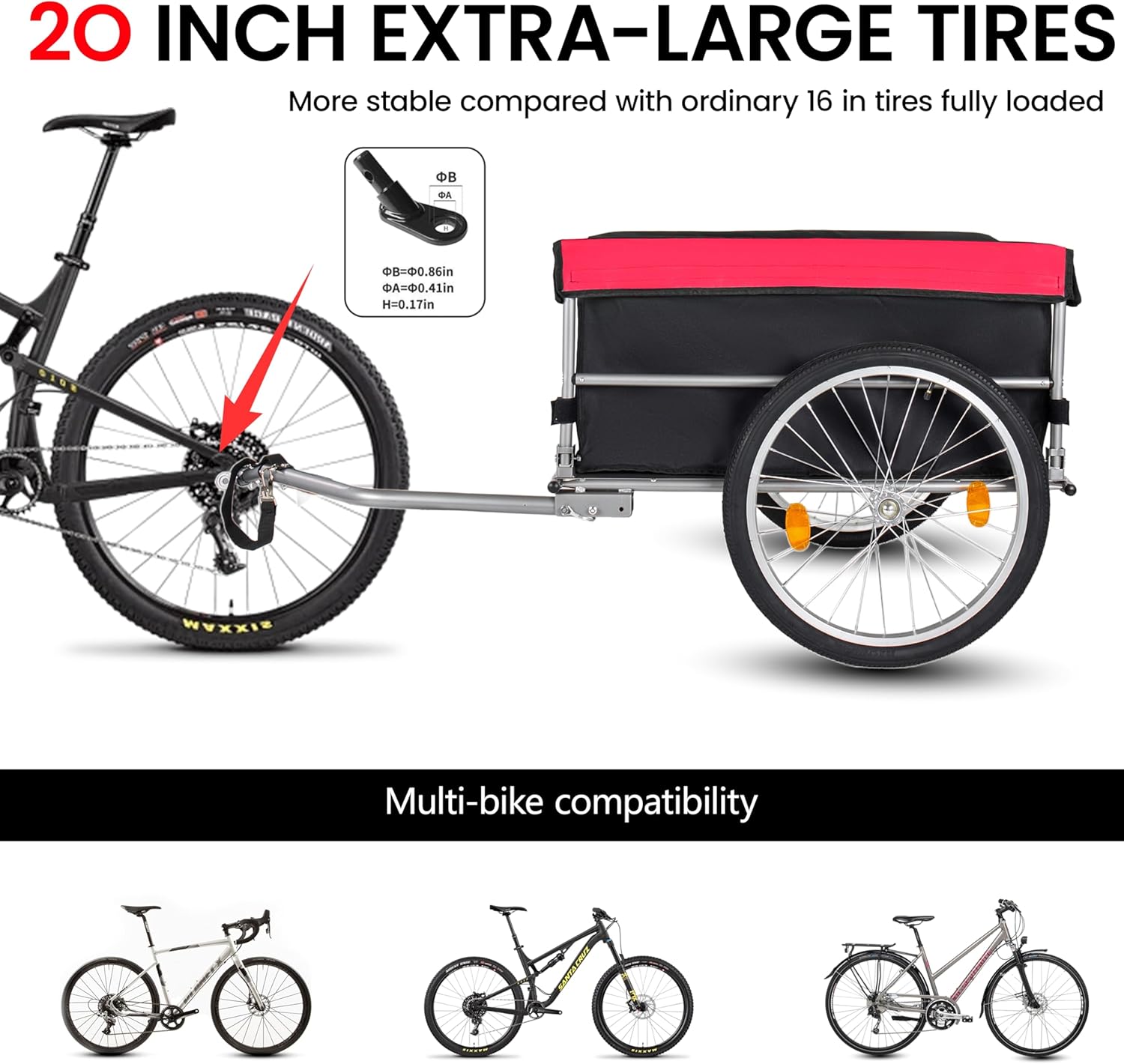 Q1: Is this bike trailer strong enough to carry heavy groceries or camping gear for trips?A: Yes! This heavy duty bike wagon supports up to 120 lbs; its sturdy metal frame safely holds groceries; camping gear; tools and more for errands or outdoor adventures.Q2: Will this trailer feel wobbly when I’m hauling a full load?A: No, this bike trailer for adults uses 20-inch extra-large rubber tires with iron hubs; it delivers a smoother, more stable ride than standard 16-inch wheels even when fully loaded.Q3: Can I use this trailer in rainy weather without my cargo getting wet?A: Absolutely! This foldable bicycle camper trailer is made with waterproof one-piece fabric; it also has a removable protective cover to shield your items from rain; dirt and debris.Q4: Is this trailer hard to set up or store when I’m not using it?A: Not at all! This metal sidecar for ebike has a versatile coupler that fits most bikes; folding poles and velcro fasteners make assembly and disassembly quick; it’s easy to store when not in use.Q5: Is this cargo trailer safe to ride with at night or on busy streets?A: Yes! This bike carts for cargo has built-in reflective lights on the wheels for better visibility; it’s compatible with a wide range of bikes; making it safe for camping; shopping and daily transport.
