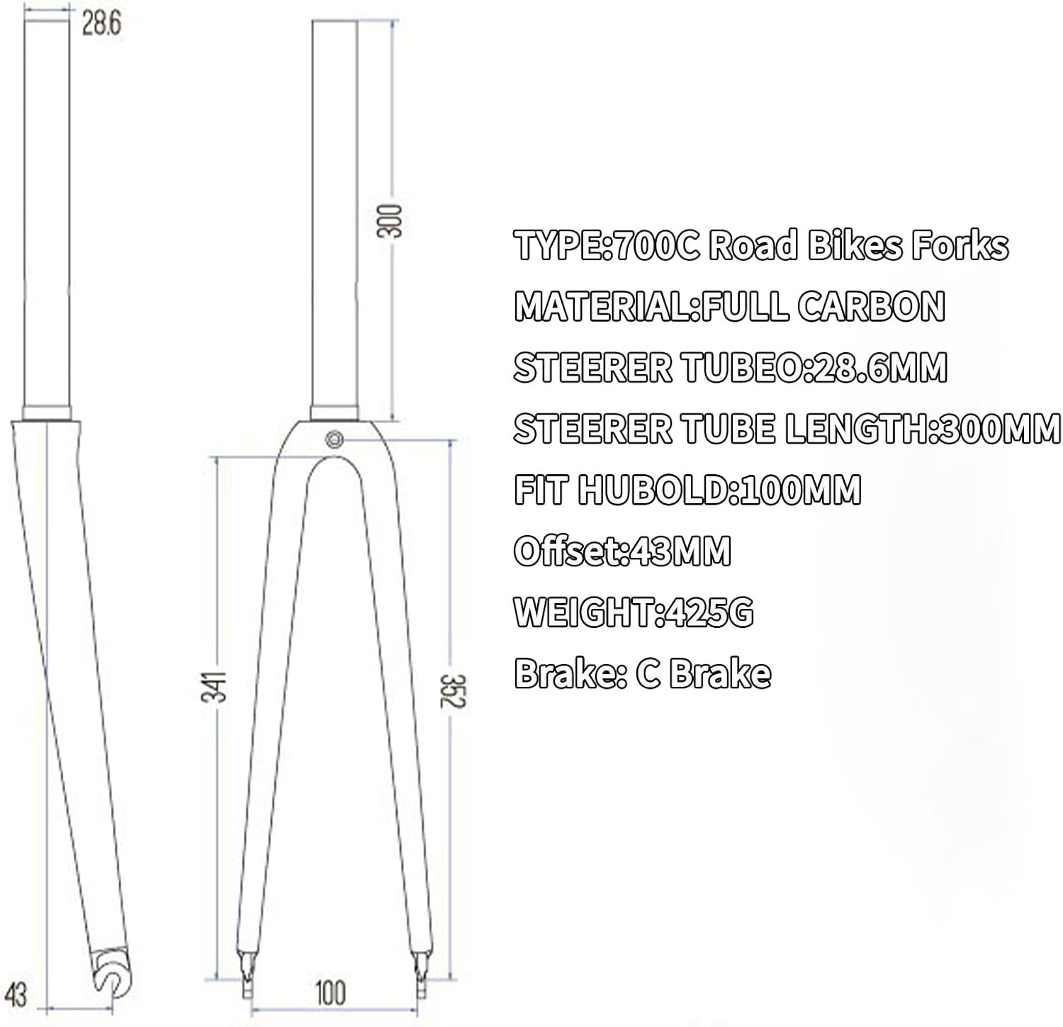 Road Bikes Rigid Fork 700C Aluminum Alloy C Brake Hard Fork 9*100mm Quick Release Front ForkInformation:Color: Matte black , Gloss blackSize: 700CMaterial: Aluminum AlloySteerer tube type: 1-1/8" straightSteer Tube Diameter: 28.6mmBottom File: 30mmSteerer tube lenth: 260mmQuick Release: 9*100mmApplicable tires: max 700C*25C tiresBrake: C BrakeScope of application: Road BikeWeight: About 722gPackage:Road Rigid Fork x 1Attention: 1: If you have any product and service questions, please contact us, we will reply you within 24 hours.2.Please allow slight dimensional tolerances due to manual measurements, lighting in photography may cause color differences from real life.