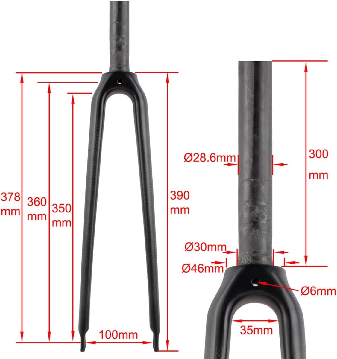Carbon Fiber Road Bikes Rigid Fork 700C Gravel Hard Fork C Brake 9*100mm Quick Release Front Fork 1-1/8 Straight/1-1/2 Tapered Steerer Tube ThreadlessGravel Bikes Rigid Fork Information:Color: Glossy Black,Matte BlackSize: 700CMaterial: T800 carbon fiberSteerer tube type: 1 1/8\\\\u2018\\u2018straight; 1 1/2\\\\u2018\\u2018 tapered(threadless)Steer Tube Diameter: 28.6mmBottom File: 30/40mmSteerer tube lenth: 300mmQuick Release: 9*100mmFork width: 100mmApplicable tires: max 700C*25C tiresBrake: C brakeScope of application: Road bikesWeight: About 369g±20g(Straight); 397g±20g(Tapered)Package:Rigid Fork x 1Note:Please allow slight dimensional tolerances due to manual measurements, lighting in photography may cause color differences from real life.Please check the size details in our list carefully according to the actual condition of your Bikes to make sure you buy the fit fork.Due to different production batches, there may be slight differences in the color, appearance, shape, and details of individual parts. If you have any questions, please feel free to contact us, thank you!
