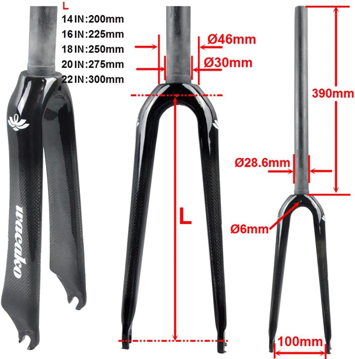 Carbon Fiber BMX Rigid Fork 14IN 16IN 18IN 20IN 22IN Rigid Fork C Brake Quick Release 74/100mm 28.6mm 1-1/8" Straight Steerer Bicycle Front Fork for Folding bikeBike Rigid Fork Information:Size: 14IN/16IN/18IN/20IN/22IN Material: Full carbon fiberBrake: C brakeHead tube: 1-1/8" straight tube threadless 28.6mmSteerer tube length: 390mmQuick Release Fork width : 74mmQuick Release Fork width : 100mmBike Type: Folding Bike,BMXWeight: about 381±5g(20in)Packaging:1* bike rigid forkNote:1. Please check the size details in our list carefully according to the actual condition of your bike to make sure you buy the fit Bike fork.2. Due to different production batches, there may be slight differences in the color, appearance, shape, and details of individual parts.3. If you have any questions, please feel free to contact us, thank you!